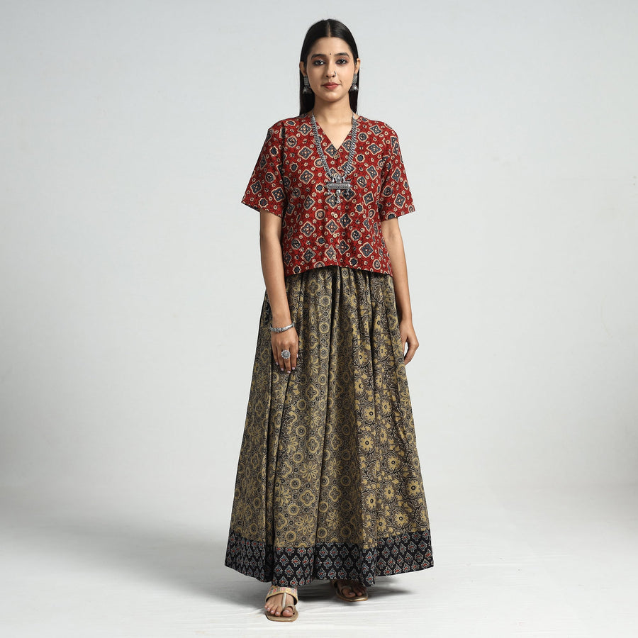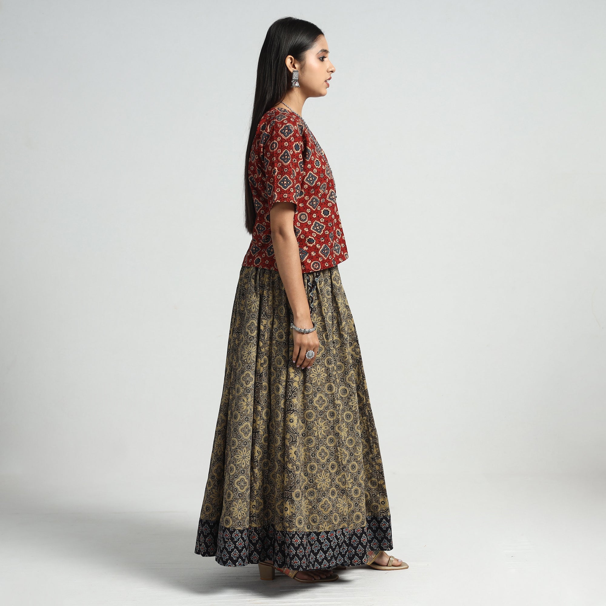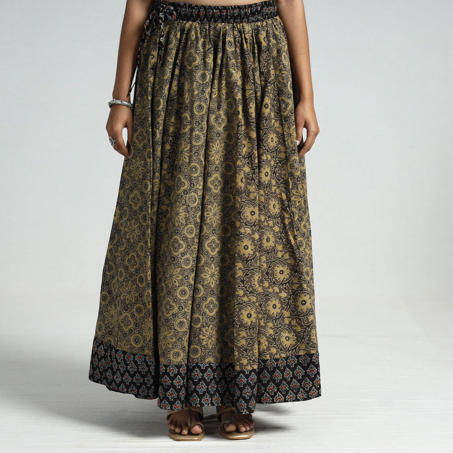 Fine quality brown ajrakh block printed natural dyed pure cotton patchwork long skirt featuring a waist tie up closure, made using natural dyes through traditional ajrakh technique of hand-block printing practised by the master artisans in Kutch region of Gujarat.