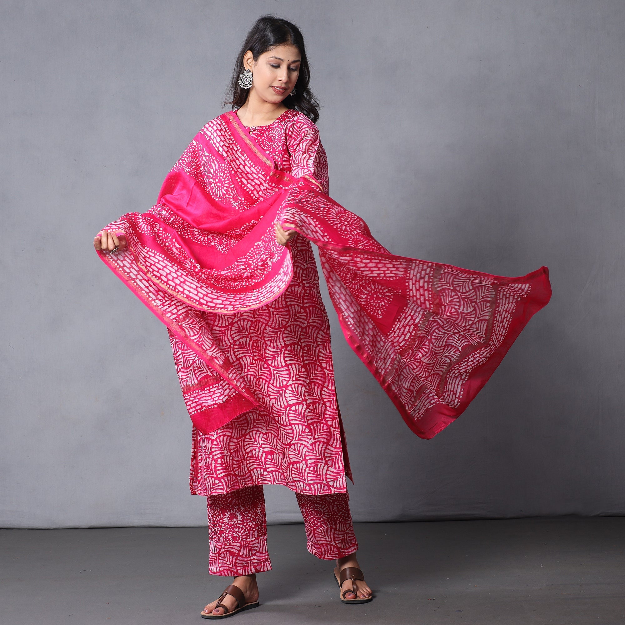 Look and feel beautiful in this uniquely designed Pink hand-batik printed chanderi silk side pocket long Kurta with dupatta & palazzo set. This suit is perfect for your special occasion. Batik is a technique of wax-resist dyeing applied to whole cloth, or cloth made using this technique. The traditional designs and motifs in Indian batik are often passed down from one generation to another.