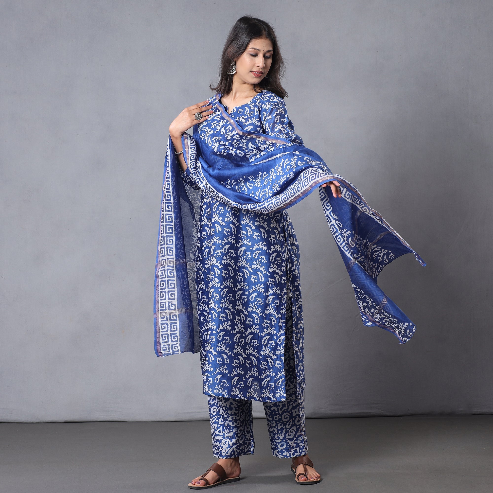 Look and feel beautiful in this uniquely designed Blue batik printed chanderi silk side pocket long kurta with dupatta & palazzo set. This suit is perfect for your special occasion. Batik is a technique of wax-resist dyeing applied to whole cloth, or cloth made using this technique. The traditional designs and motifs in Indian batik are often passed down from one generation to another.