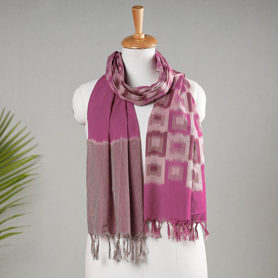 Fine quality handloom mercerized cotton pochampally ikat stole. Bleed free VAT dyed used. Ikat (Ikkat) is a dyeing technique used to pattern textiles that employs a resist dyeing process similar to tie-dye on either the warp or weft fibers prior to dyeing. This classic stole acts as the perfect add-on to a casual look.