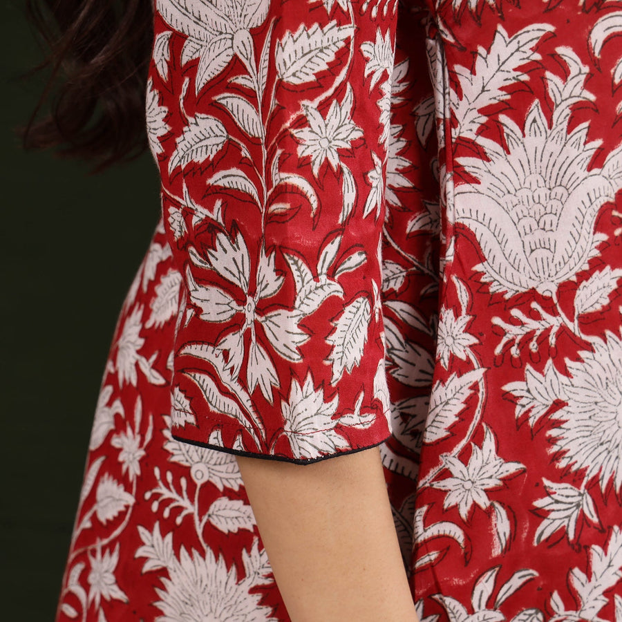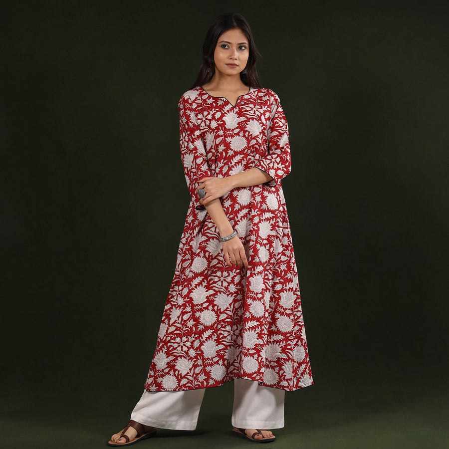 Look and feel beautiful in this uniquely designed sanganeri block printed cotton long kurta with side pocket. This cotton kurta makes you comfortable with ease all day long. Sanganeri is a hand-block printing technique originating from Sanganer, a village in the southern part of Jaipur, Rajasthan. Bleed free VAT dyes used.