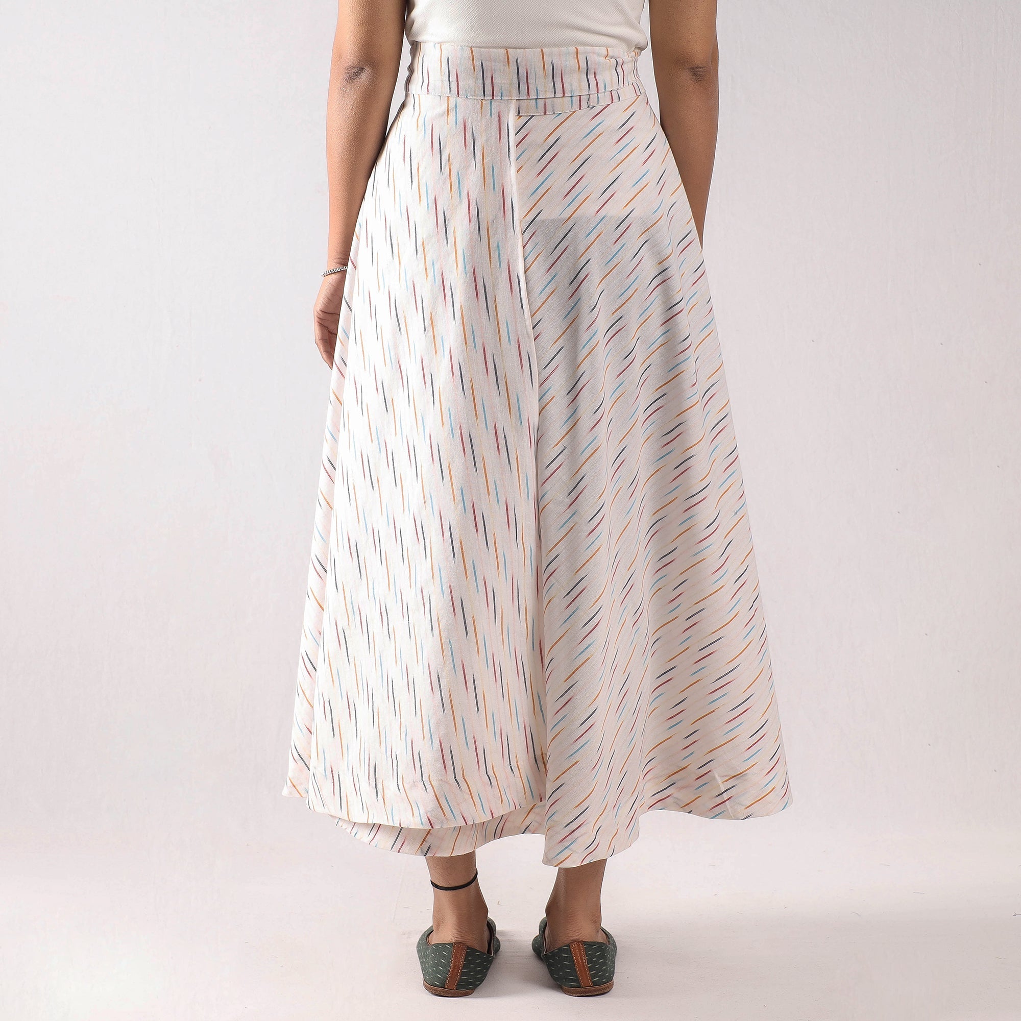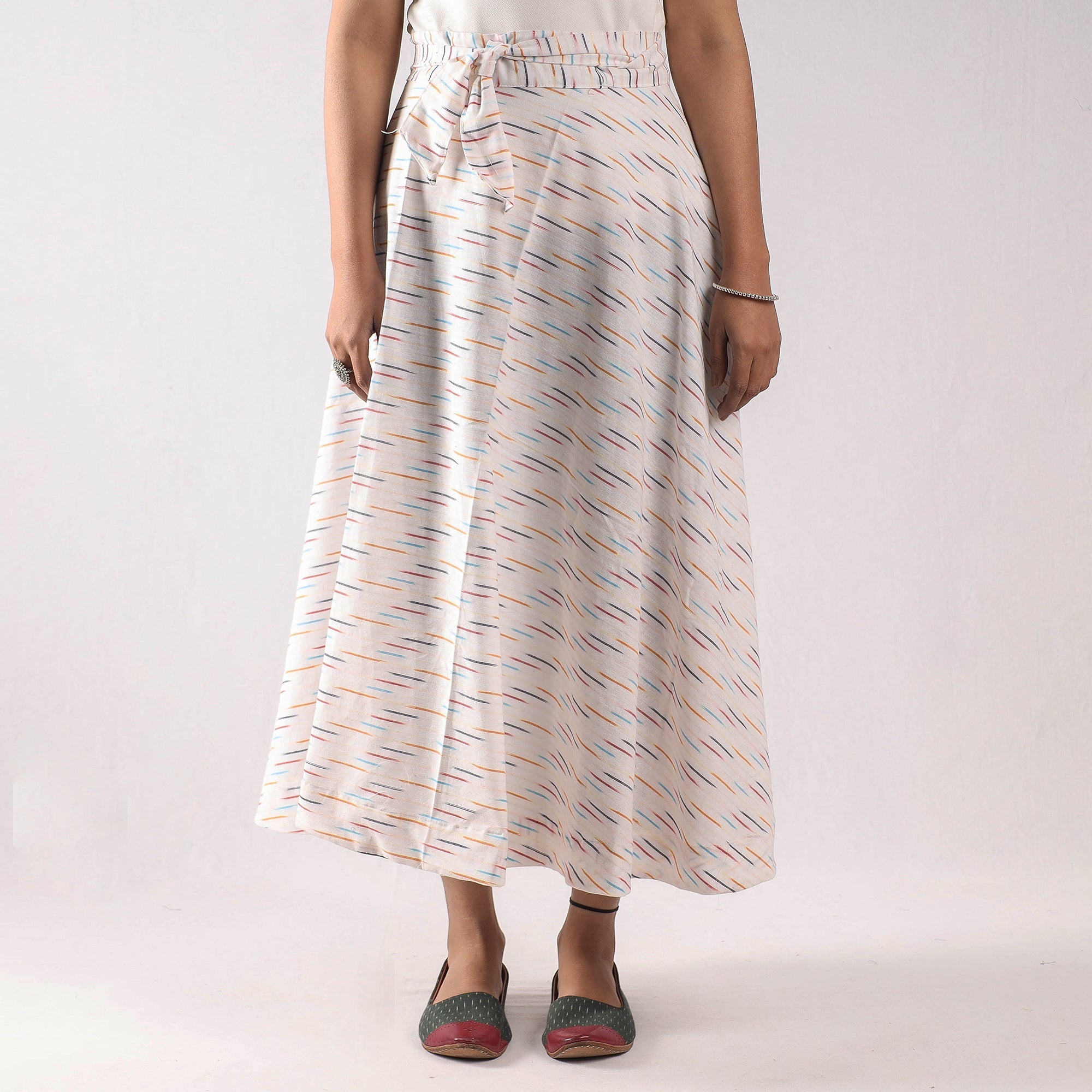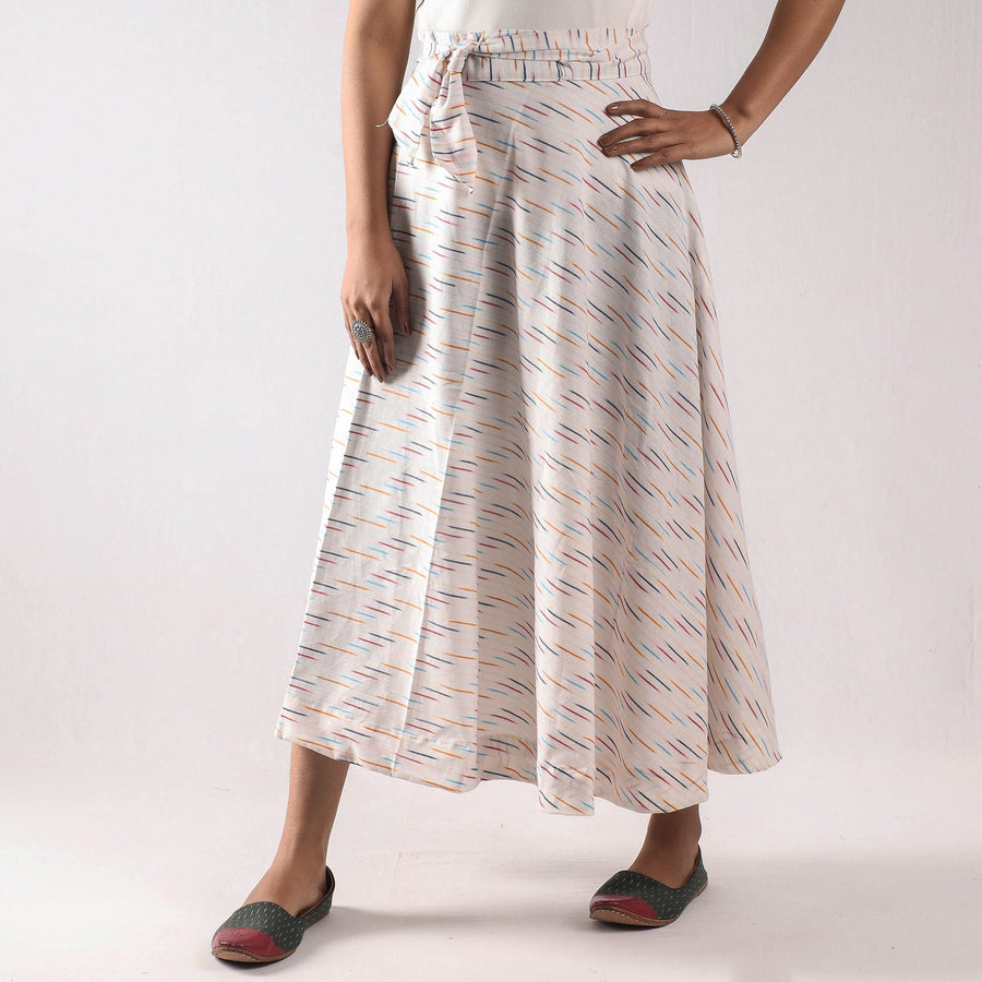 Fine quality white pochampally ikat weave pure cotton wrap around skirt featuring a waist tie up closure. Ikat is a dyeing technique used to pattern textiles that employs a resist dyeing process similar to tie-dye on either the warp or weft fibers prior to dyeing. Ikat has lovely patterns and are world famous for their extremely beautiful colors, texture and designs. Indian Ikat is always admired by the fashion designers around the world.