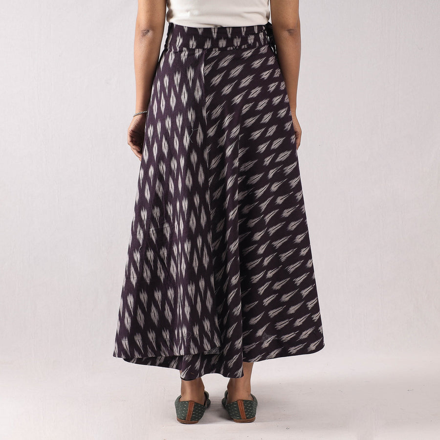 Fine quality purple pochampally ikat weave pure cotton wrap around skirt featuring a waist tie up closure. Ikat (Ikkat) is a dyeing technique used to pattern textiles that employs a resist dyeing process similar to tie-dye on either the warp or weft fibers prior to dyeing. Ikat has lovely patterns and are world famous for their extremely beautiful colors, texture and designs. Indian Ikat is always admired by the fashion designers around the world.