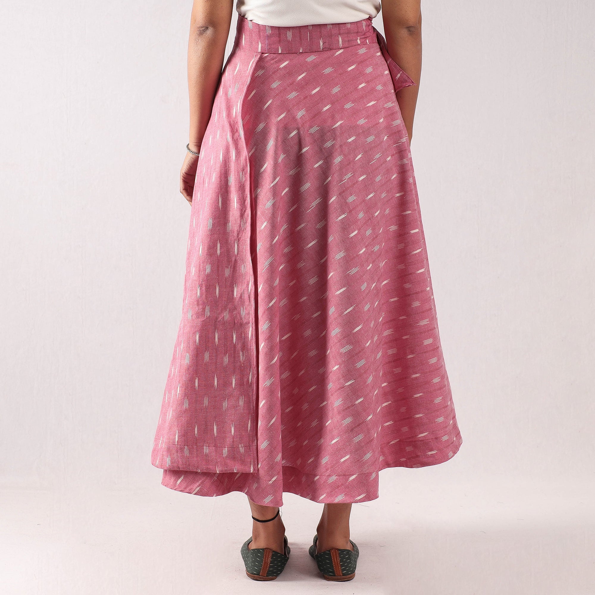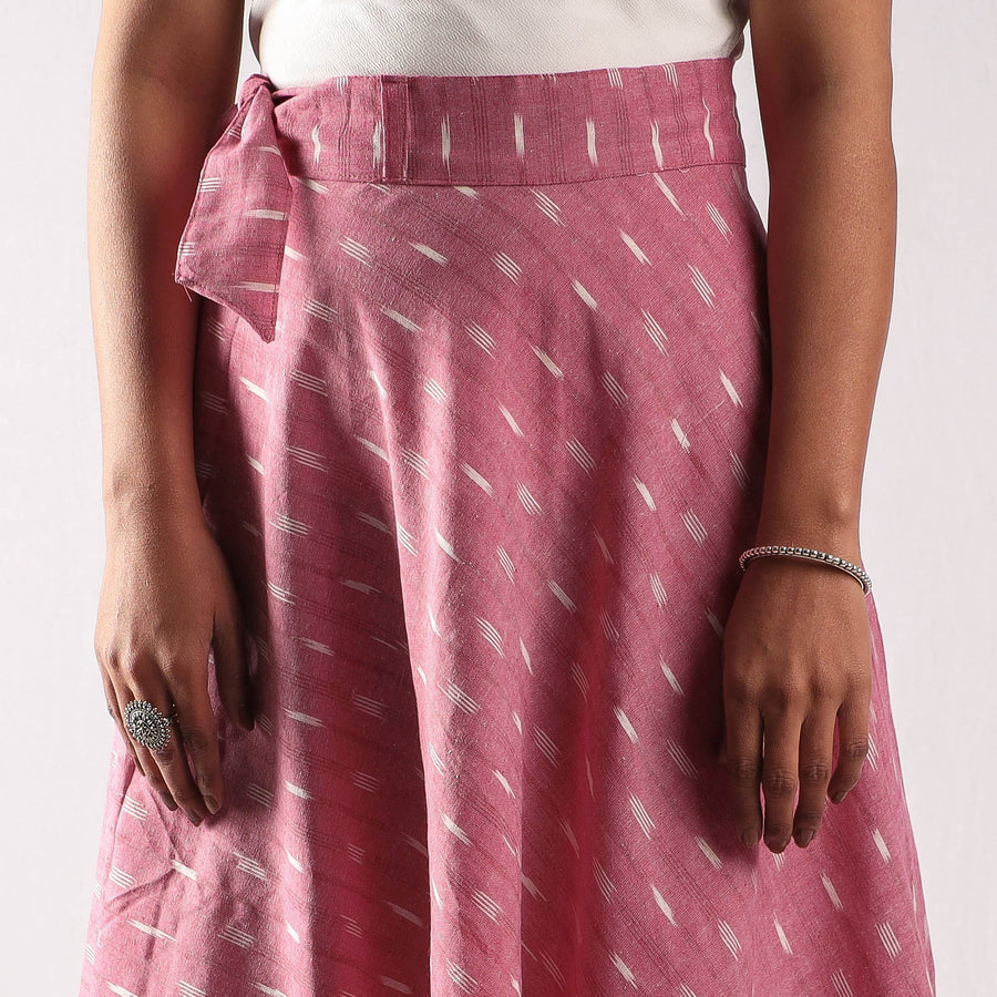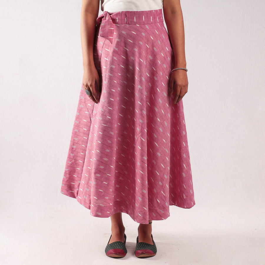 Fine quality pink pochampally ikat weave pure cotton wrap around skirt featuring a waist tie up closure. Ikat (Ikkat) is a dyeing technique used to pattern textiles that employs a resist dyeing process similar to tie-dye on either the warp or weft fibers prior to dyeing. Ikat has lovely patterns and are world famous for their extremely beautiful colors, texture and designs. Indian Ikat is always admired by the fashion designers around the world.