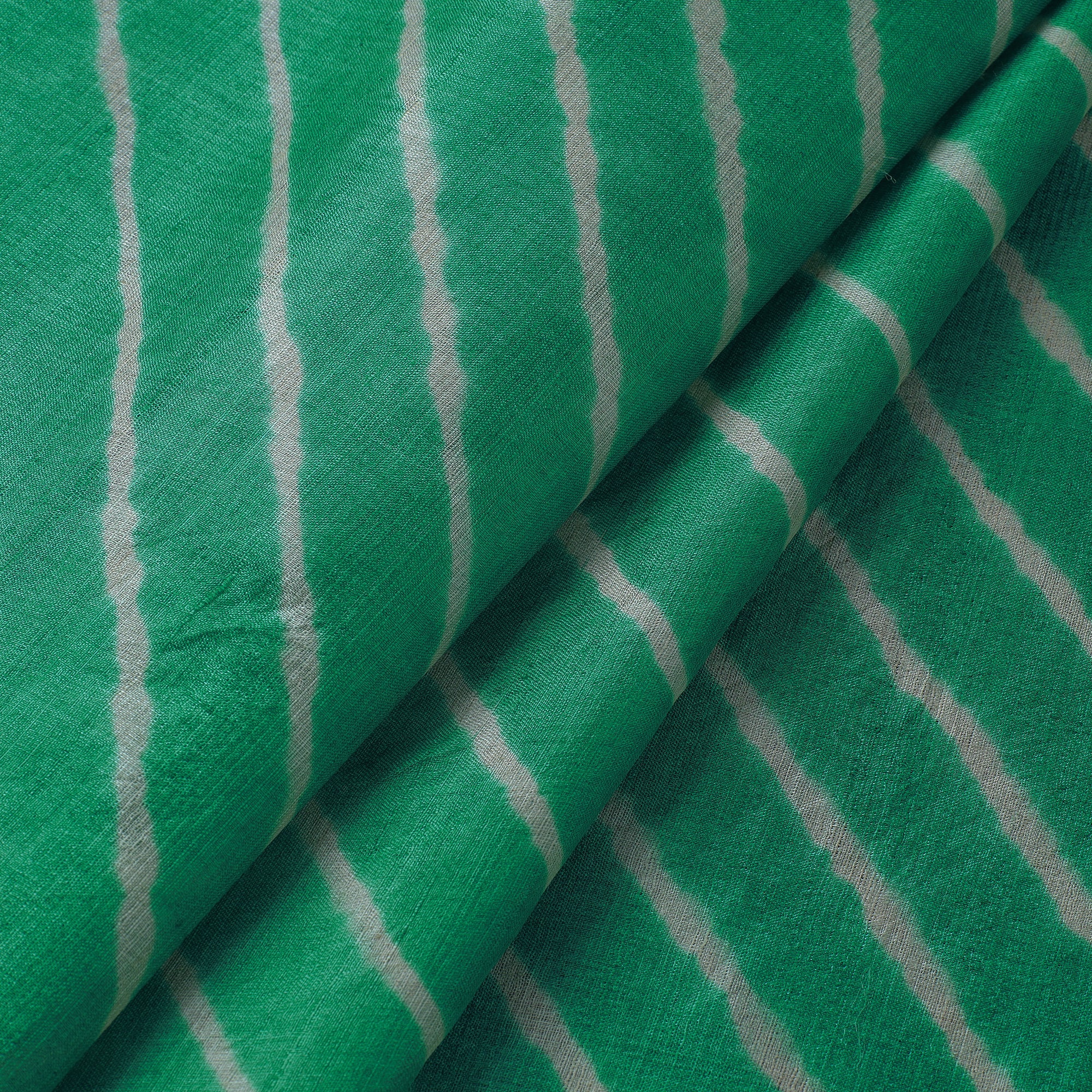Fine quality green original leheriya tie-dye pure tussar silk handloom fabric. Azo free dye has been used to make this fabric. The wavy patterns on this fabric have been dyed using leheriya tie & dye technique through a traditional process by the master artisan family of Badshah Miyan from the state of Rajasthan. Tussar silk is known for its unique texture, sheen of silk, and feel of cotton.