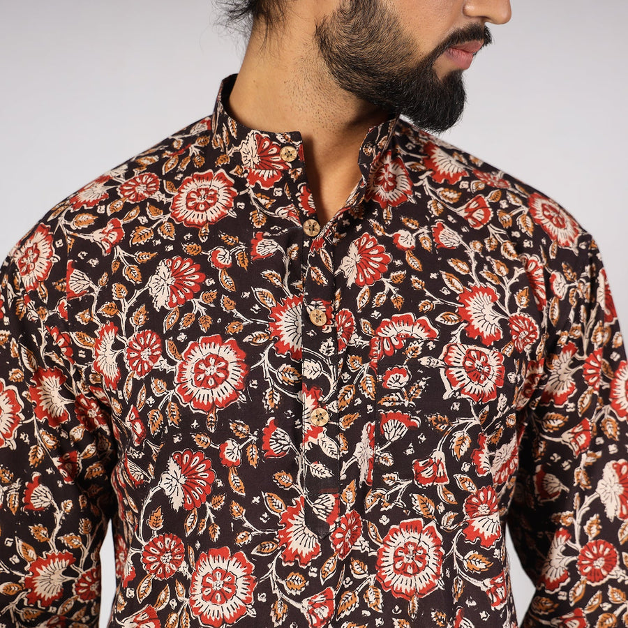 Bagru block printed cotton men's short kurta with one chest pocket, makes you comfortable with ease all day long. It's made from cotton fabric and features full sleeves, a front button placket. This casual kurta is perfect for your daily outing and for a special occasion. Made using natural dyes through traditional mud resist process by using hand carved wooden block practiced in Bagru, Rajasthan.