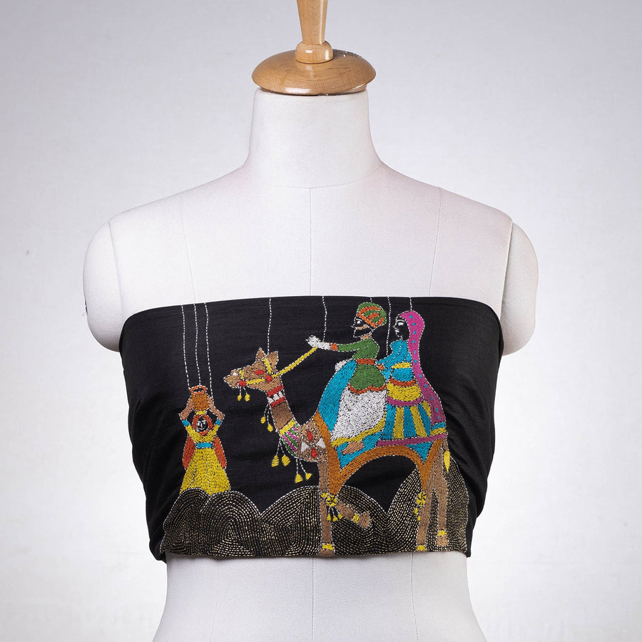 Fine quality black raw silk blouse material designed with contemporary patterns & has been hand embroidered using West Bengal's traditional craft technique of Kantha. You can get this stitched in your desired pattern and pair it up with your special sarees to complete a trendy and ethnic look.
