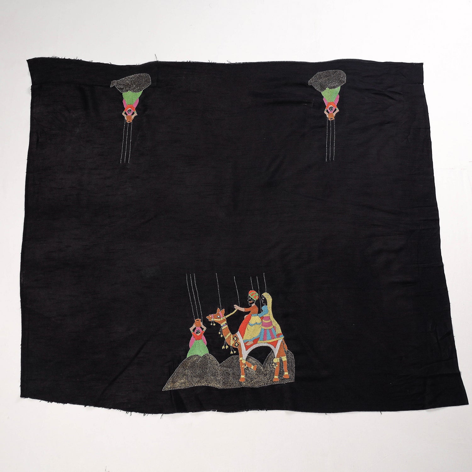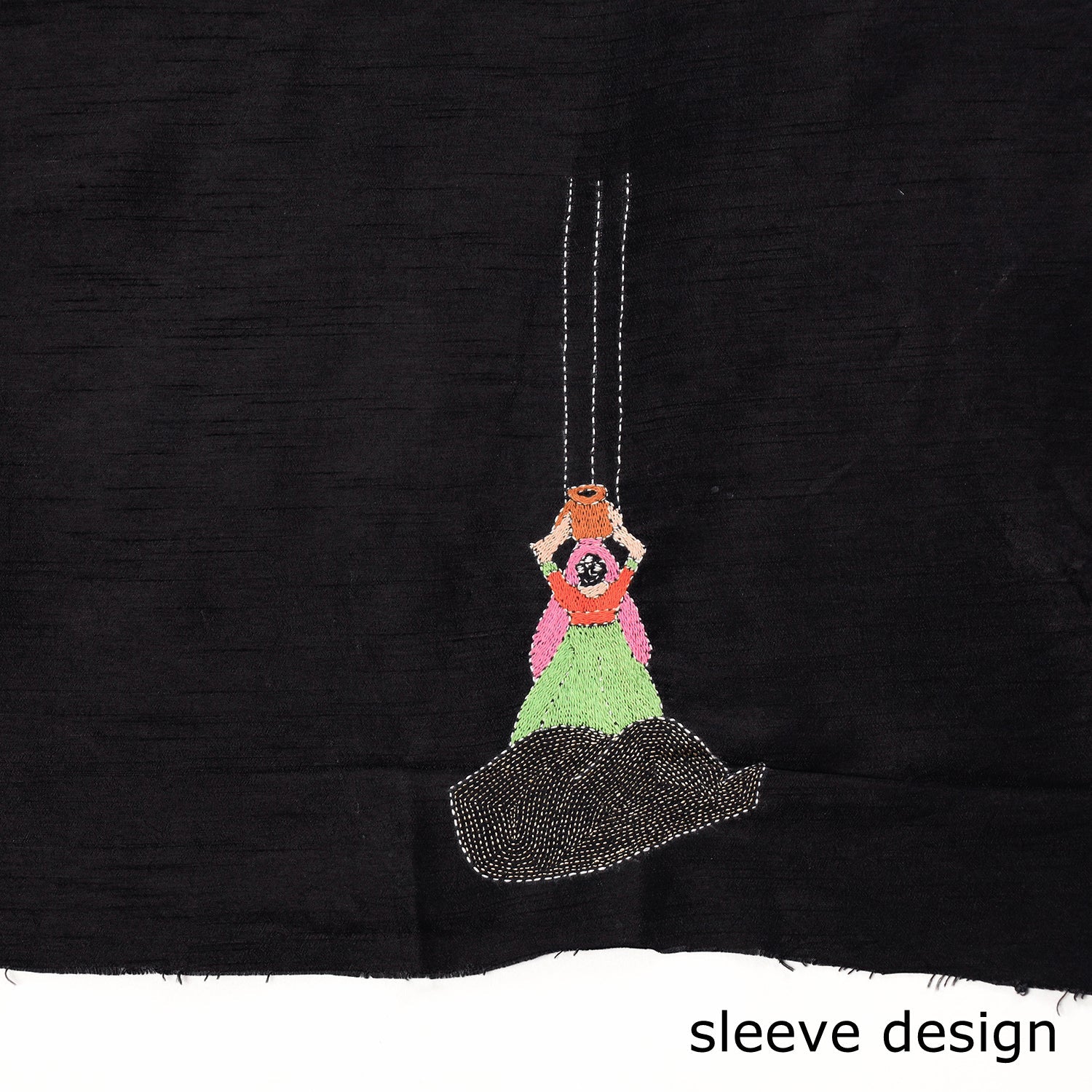 Fine quality black raw silk blouse material designed with contemporary patterns & has been hand embroidered using West Bengal's traditional craft technique of Kantha. You can get this stitched in your desired pattern and pair it up with your special sarees to complete a trendy and ethnic look.
