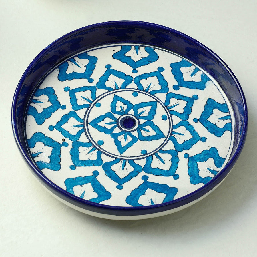 This beautiful blue serving plate is crafted from blue pottery ceramic tile. This plate makes a wonderful addition to your kitchen, dining room, or party hosting tableware set. Blue Pottery is widely recognized as a traditional craft of Jaipur. Blue Pottery is not made by clay instead the dough for blue pottery is made by mixing ground glass, quartz powder, Multani mitti, gum, soda bicarbonate, and water.