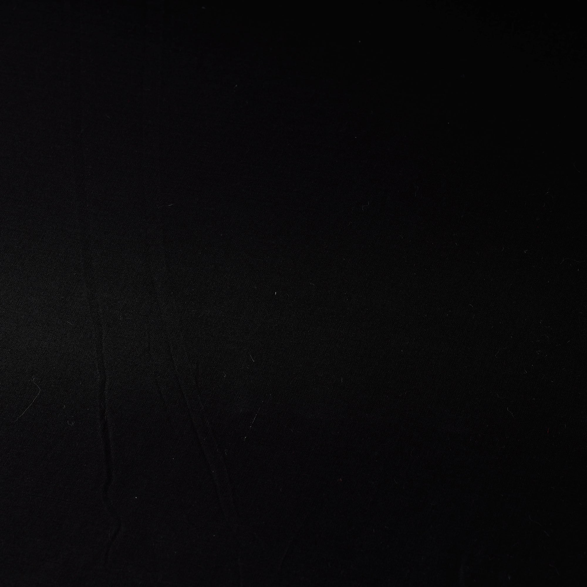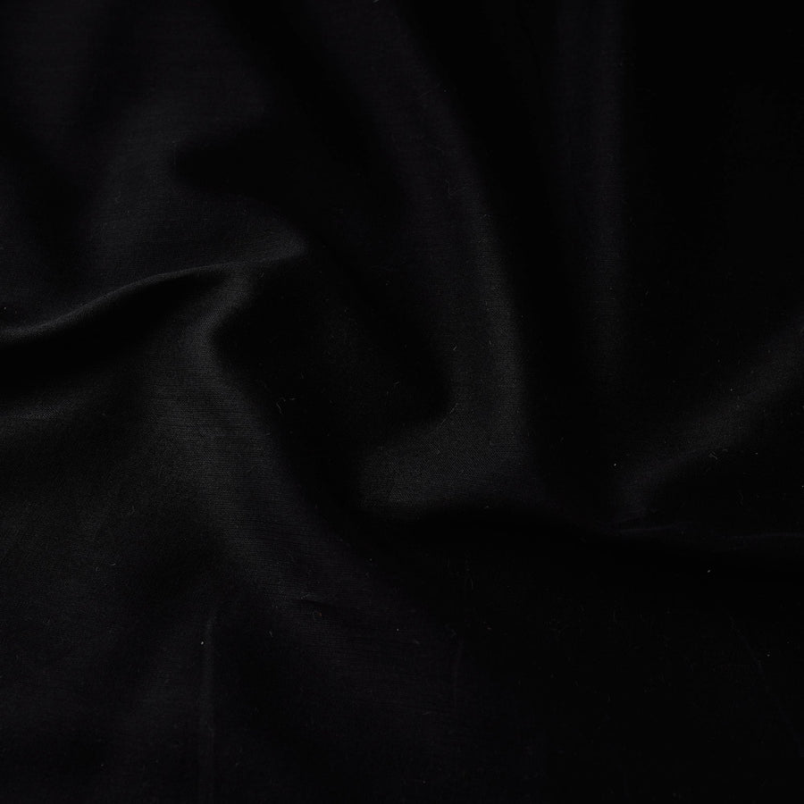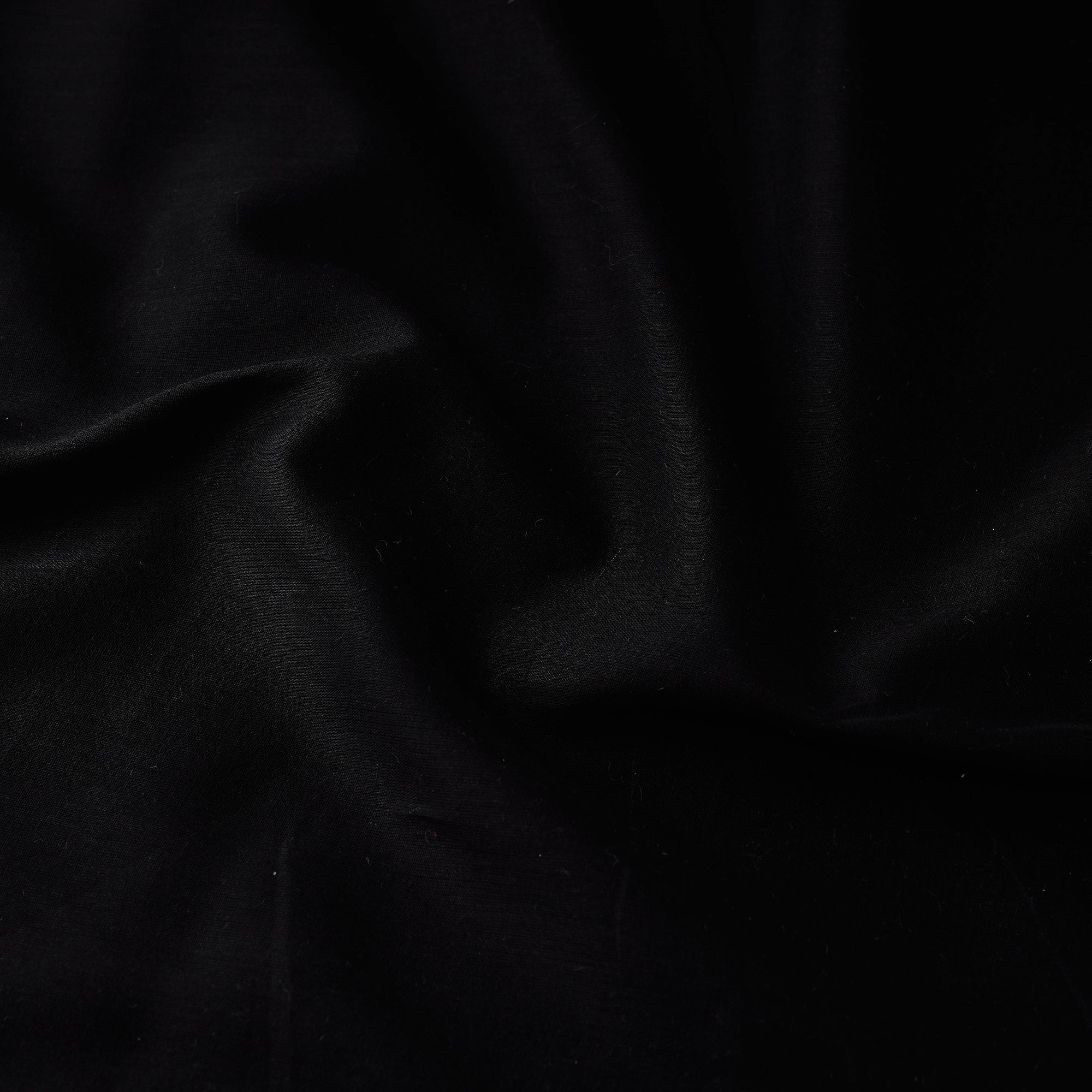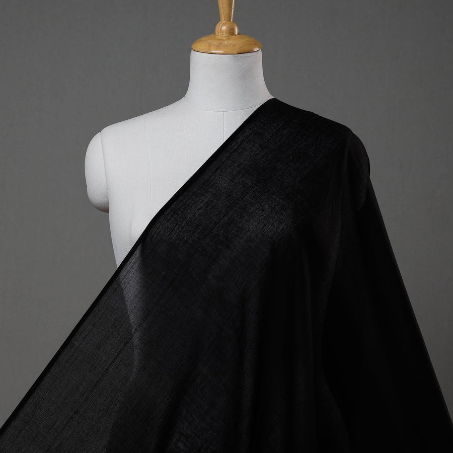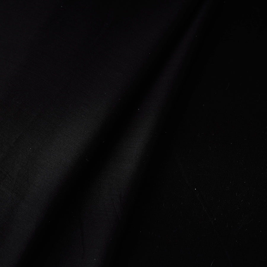 This black prewashed mul cotton fabric is of fine quality and has been dyed a plain color. It was machine made and not created through handmade processes. The fabric originates from Jaipur, Rajasthan, and is ideal for a variety of projects due to its softness and durability.