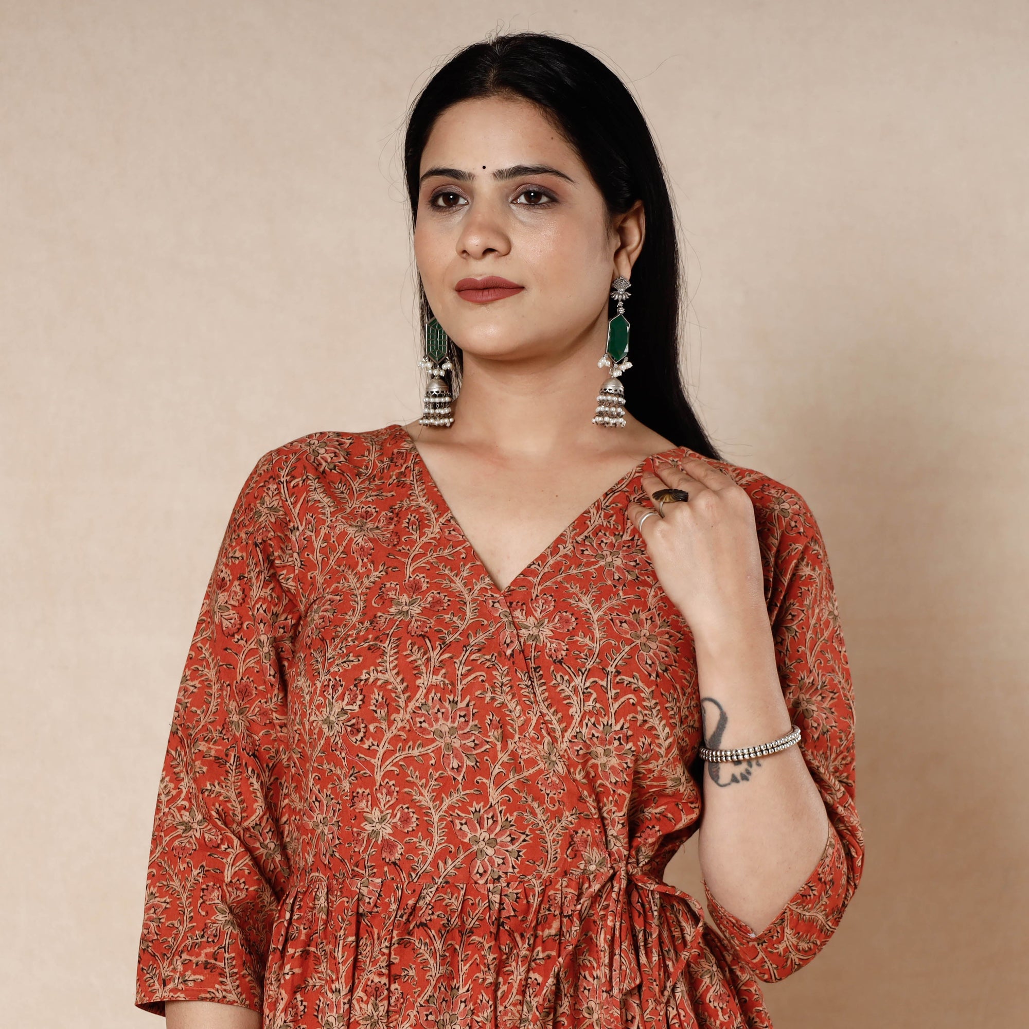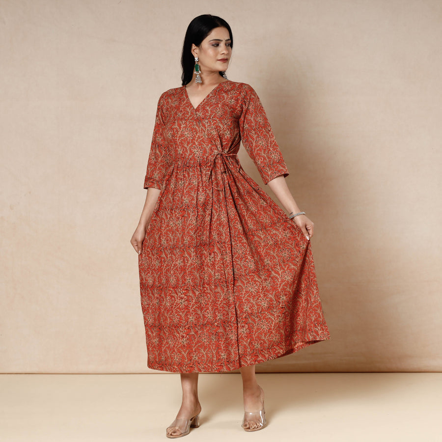 Look and feel beautiful in this uniquely designed kalamkari block print cotton flared dress. This cotton dress makes you comfortable with ease all day long. This dress is perfect for your daily outing and for a special occasion.