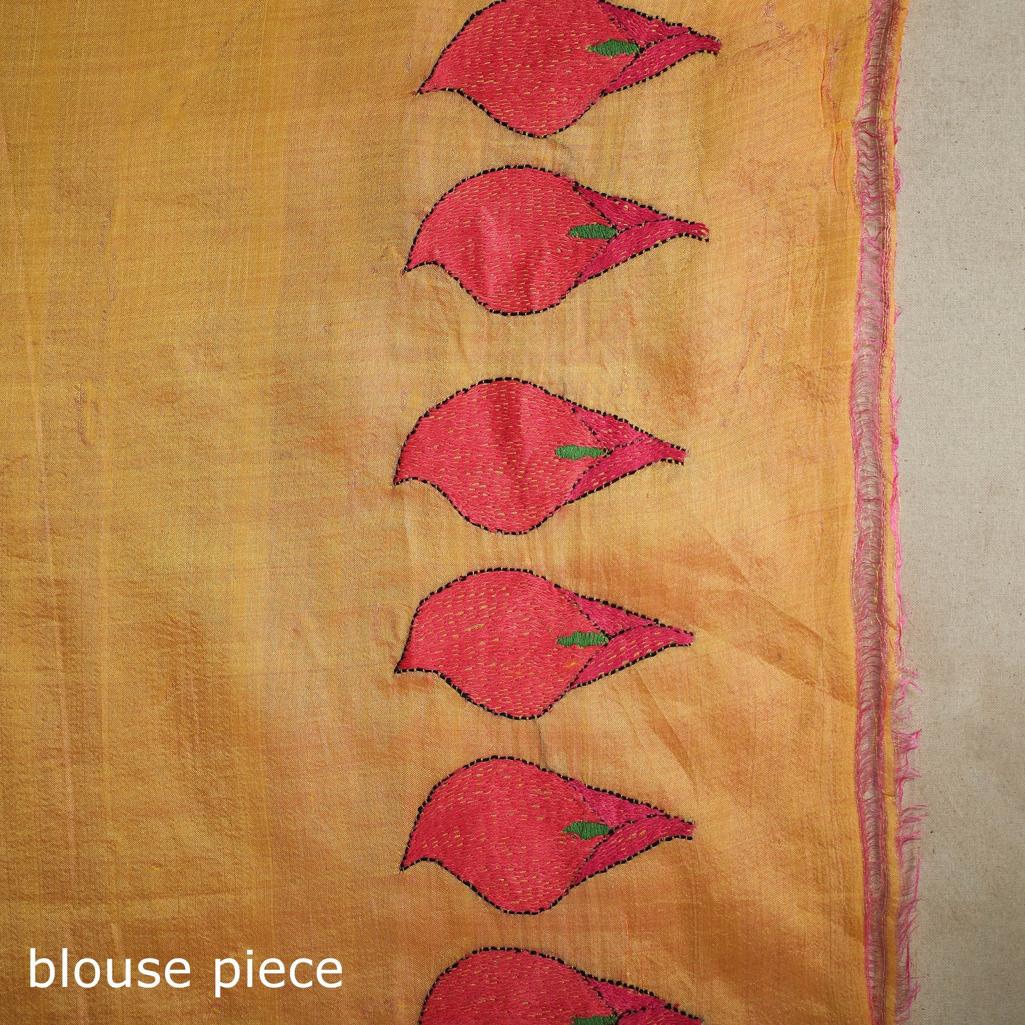 Fine quality orange handloom bengal kantha embroidery banarasi silk saree. Designed with contemporary patterns & has been hand embroidered using West Bengal's traditional craft technique of Kantha.