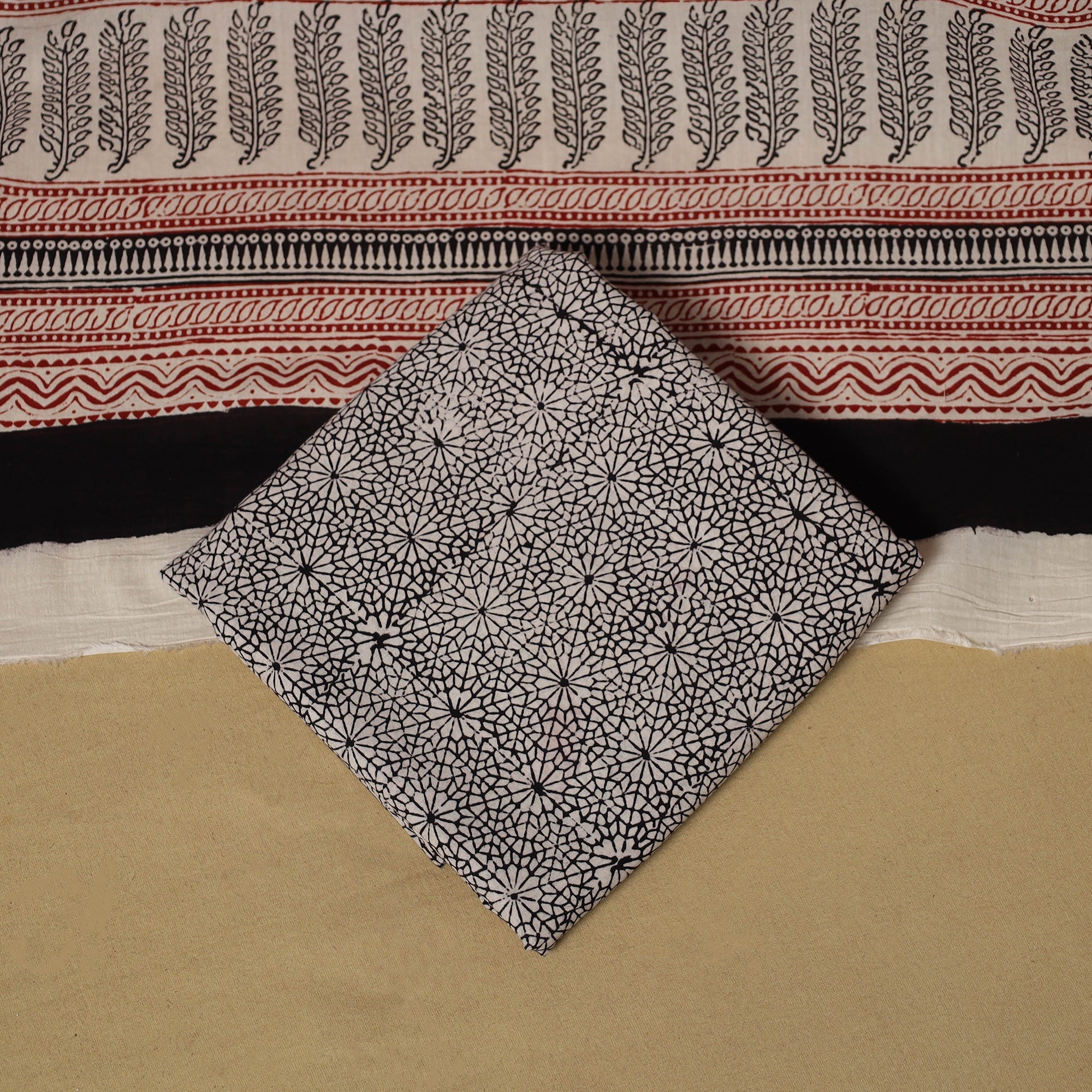 Elevate your wardrobe with this exquisite black 3pc natural dyed cotton bagh print suit material set. Crafted using traditional hand block printing by skilled artisans in Bagh, Madhya Pradesh. The intricate designs are made using natural dyes. The cotton fabric offers comfort, while the vibrant patterns add a timeless appeal.