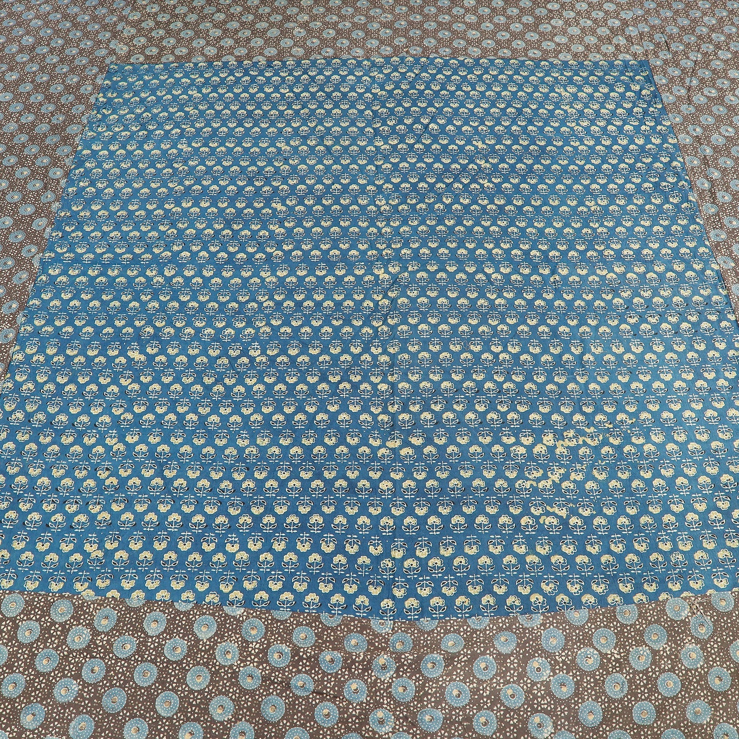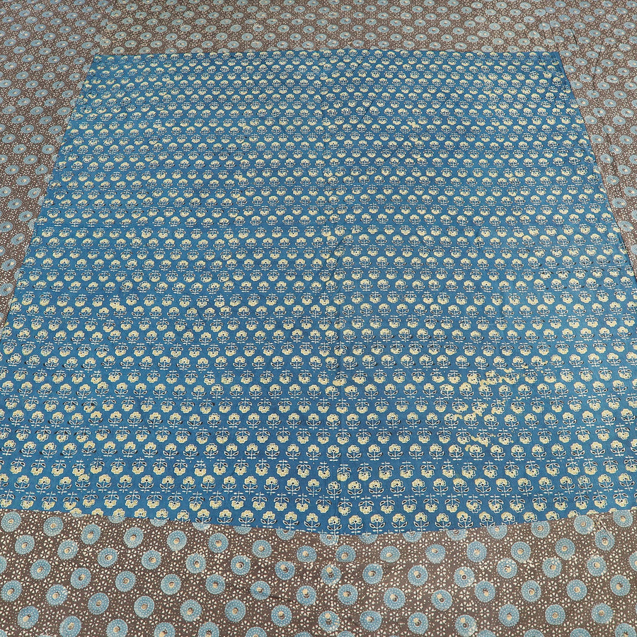 Fine quality ajrakh block printed patchwork tukdi kaam cotton double bed cover with pillow covers, made using natural dyes through traditional ajrakh technique of hand-block printing practised by the master artisans in Kutch region of Gujarat.