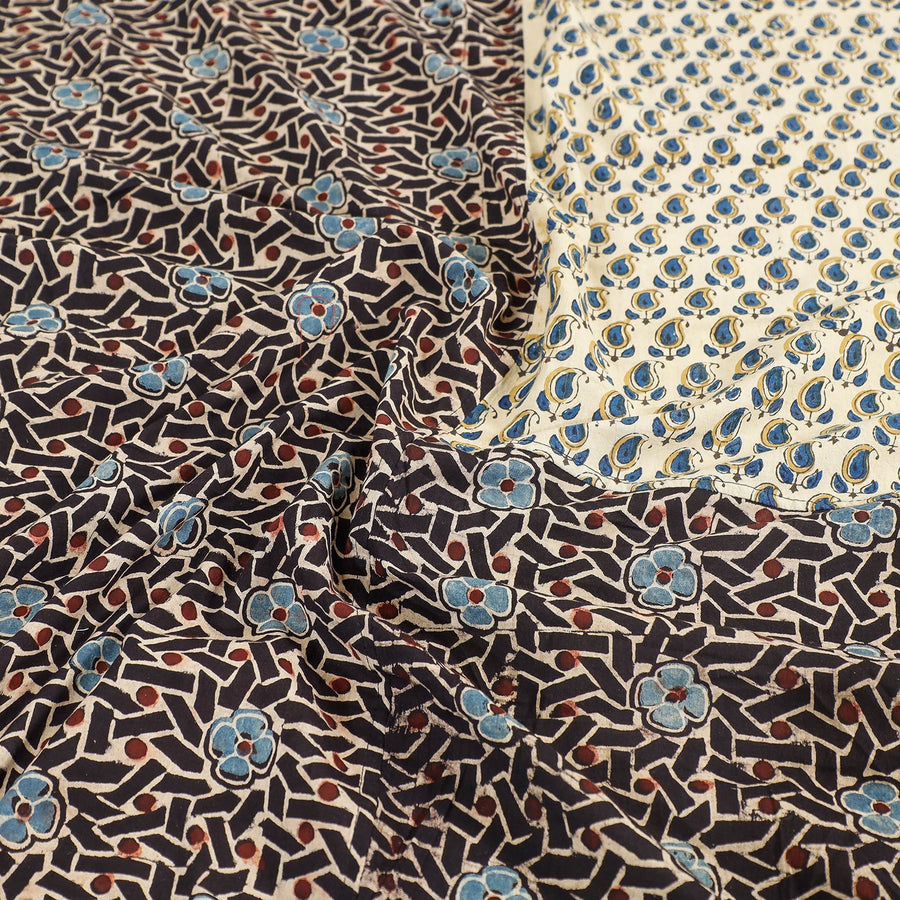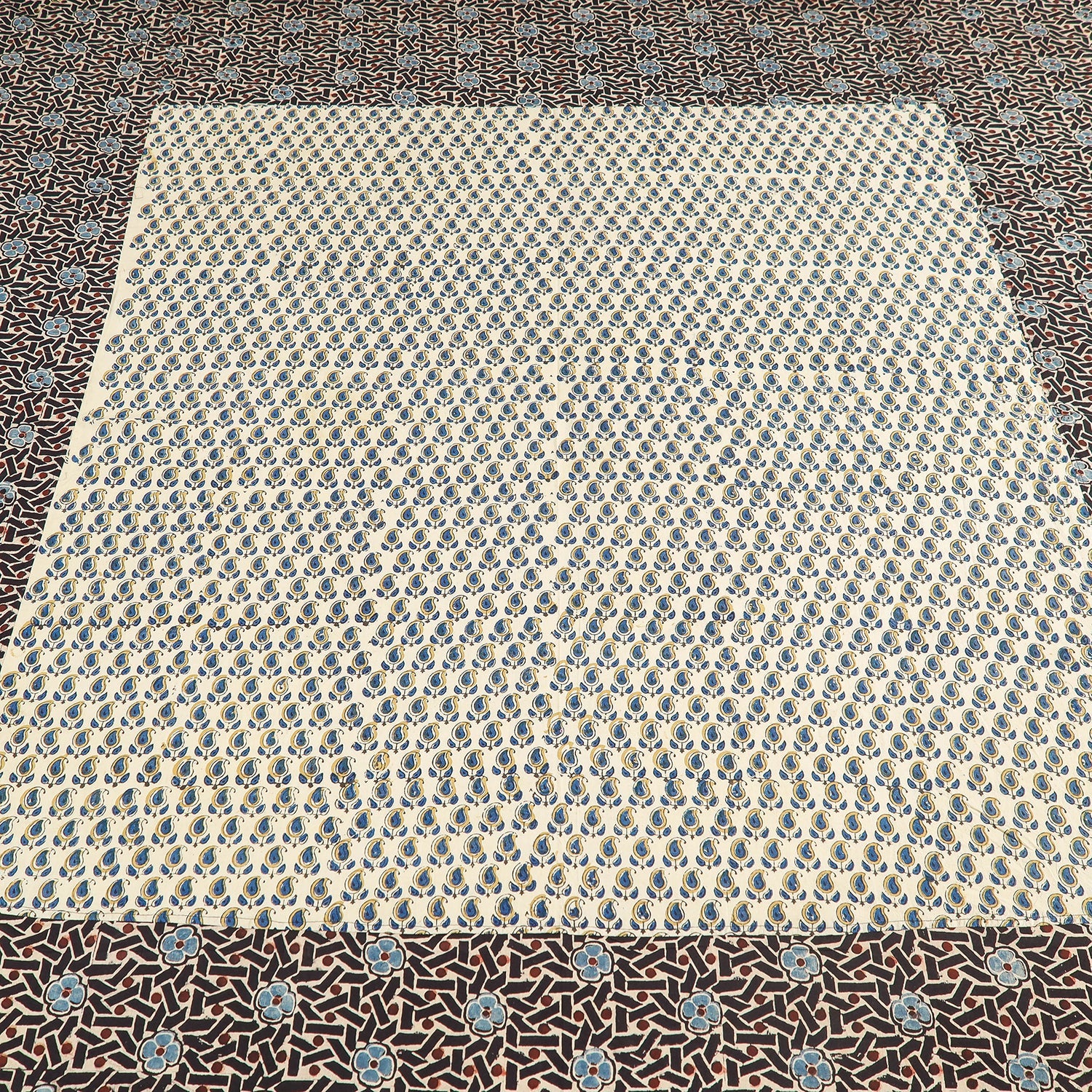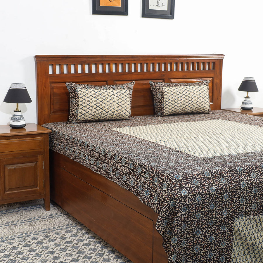 Fine quality ajrakh block printed patchwork tukdi kaam cotton double bed cover with pillow covers, made using natural dyes through traditional ajrakh technique of hand-block printing practised by the master artisans in Kutch region of Gujarat.