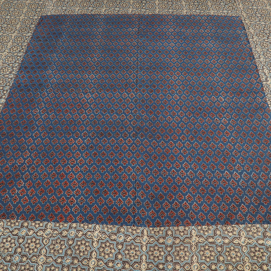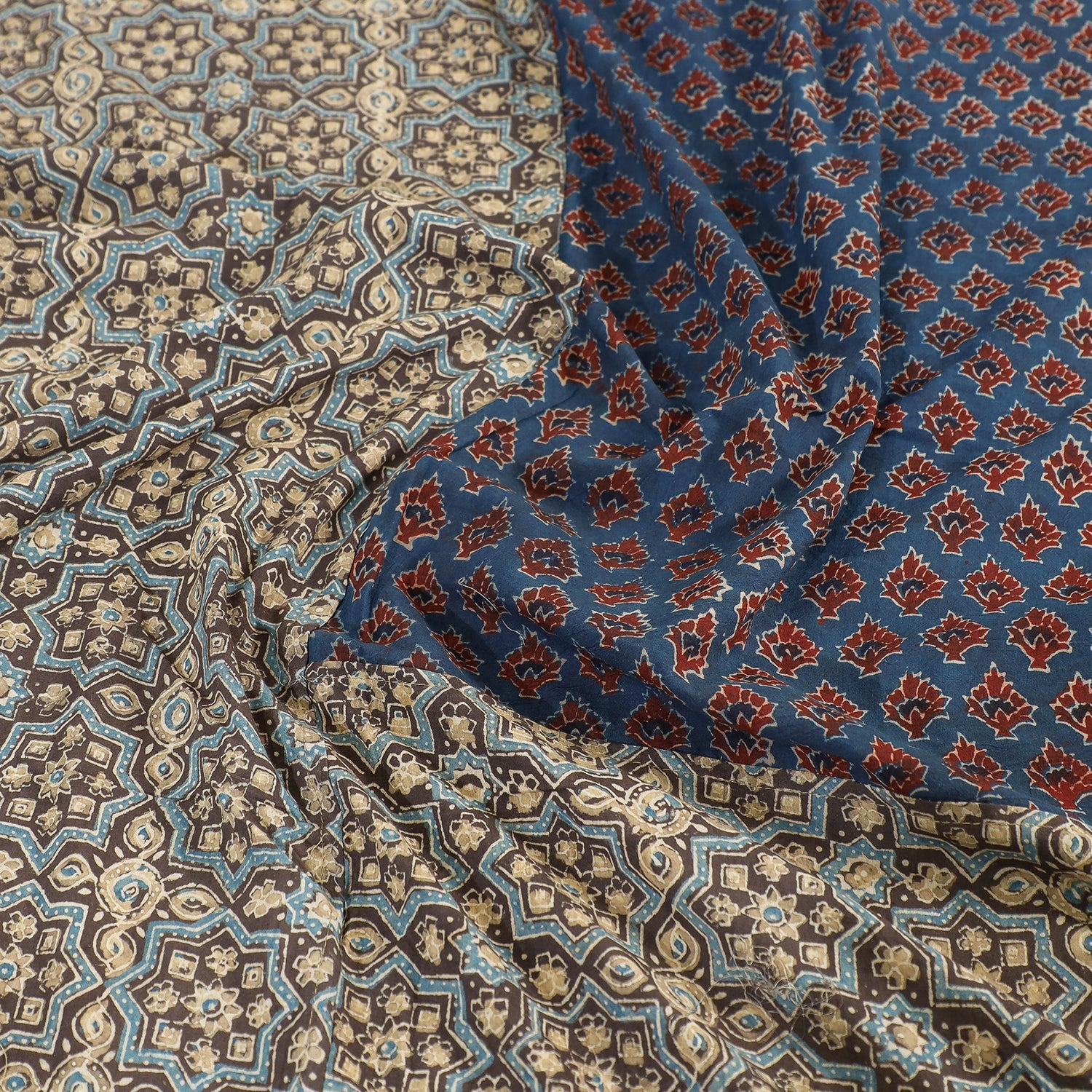 Fine quality ajrakh block printed patchwork tukdi kaam cotton double bed cover with pillow covers, made using natural dyes through traditional ajrakh technique of hand-block printing practised by the master artisans in Kutch region of Gujarat.