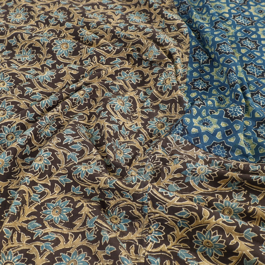 Fine quality ajrakh block printed patchwork tukdi kaam cotton double bed cover with pillow covers, made using natural dyes through traditional ajrakh technique of hand-block printing practised by the master artisans in Kutch region of Gujarat.