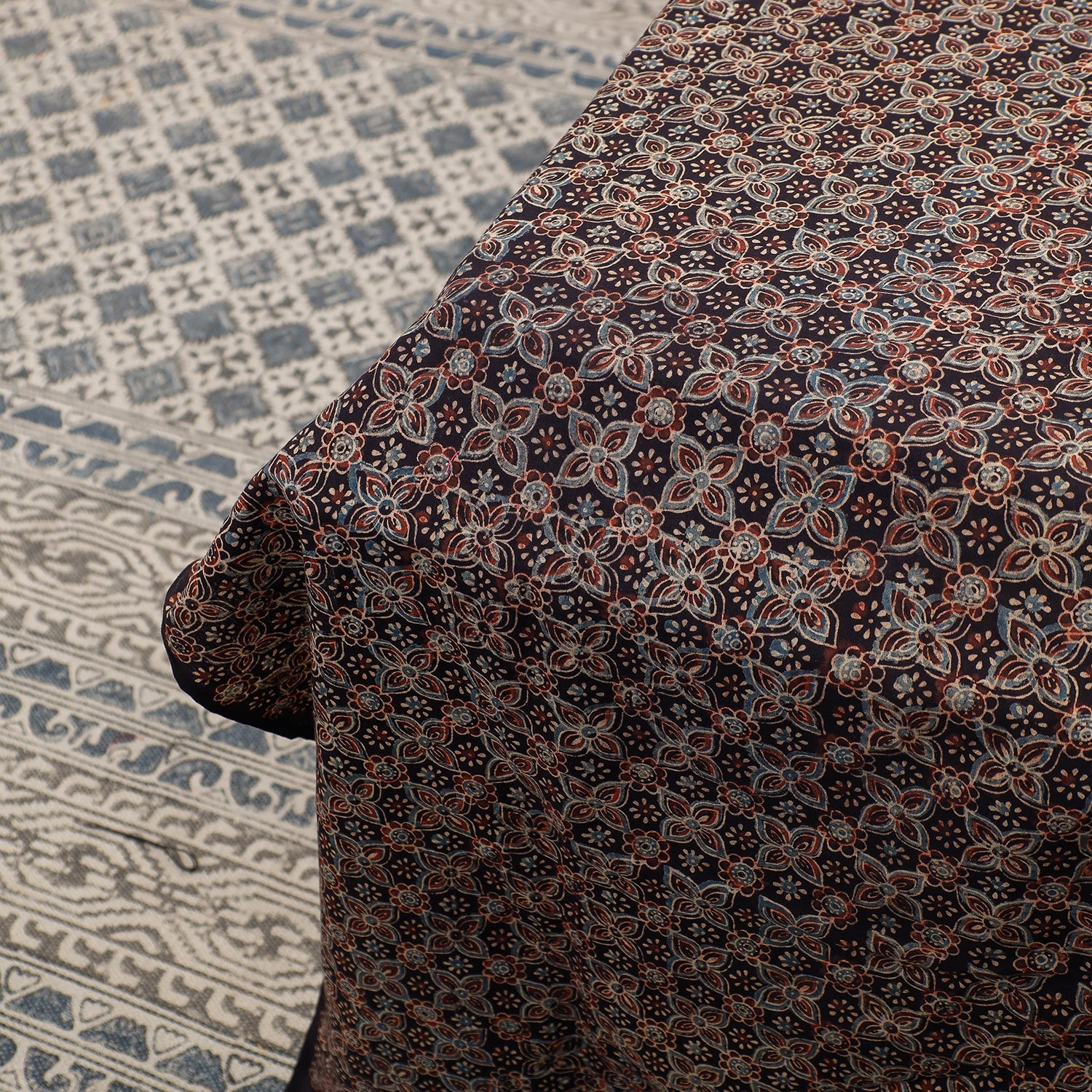 Ajrakh is a well-known traditional vegetable dyeing that resists block-printing techniques on cloth. Originated in Kutch, It is nearly around 4,500 years old practised by Khatri community of Kutch and Sikh.