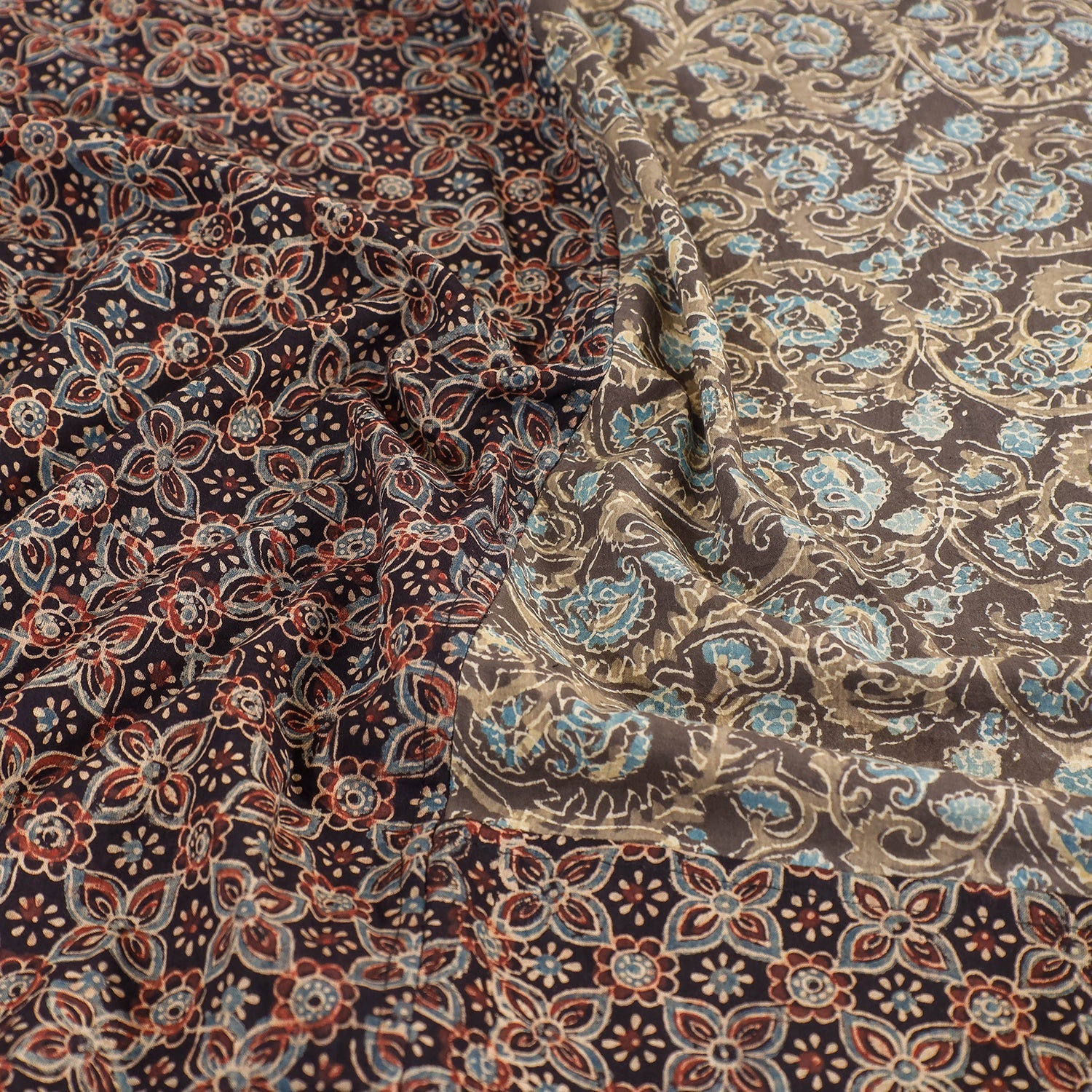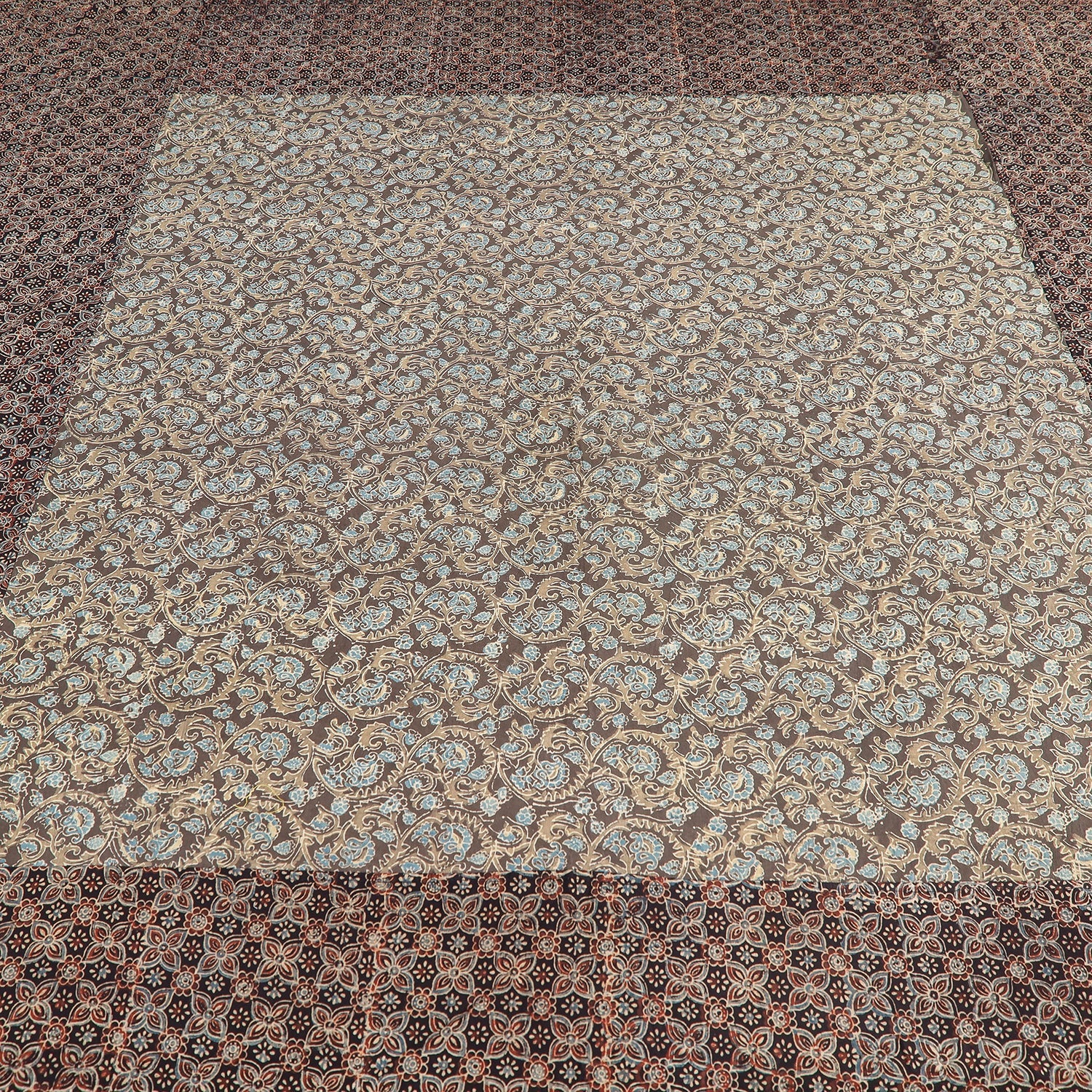 Fine quality ajrakh block printed patchwork tukdi kaam cotton double bed cover with pillow covers, made using natural dyes through traditional ajrakh technique of hand-block printing practised by the master artisans in Kutch region of Gujarat.
