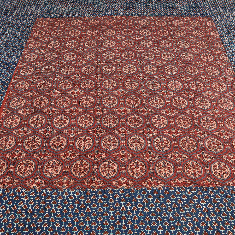 Fine quality ajrakh block printed patchwork tukdi kaam cotton double bed cover with pillow covers, made using natural dyes through traditional ajrakh technique of hand-block printing practised by the master artisans in Kutch region of Gujarat.