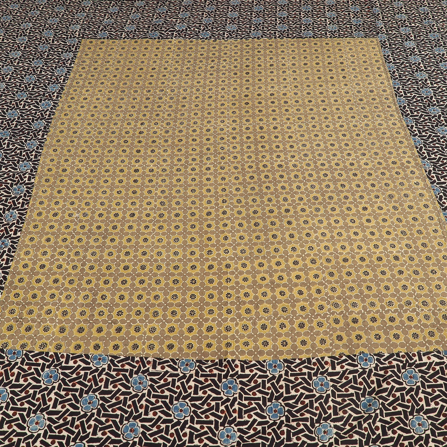 Fine quality ajrakh block printed patchwork tukdi kaam cotton double bed cover with pillow covers, made using natural dyes through traditional ajrakh technique of hand-block printing practised by the master artisans in Kutch region of Gujarat.