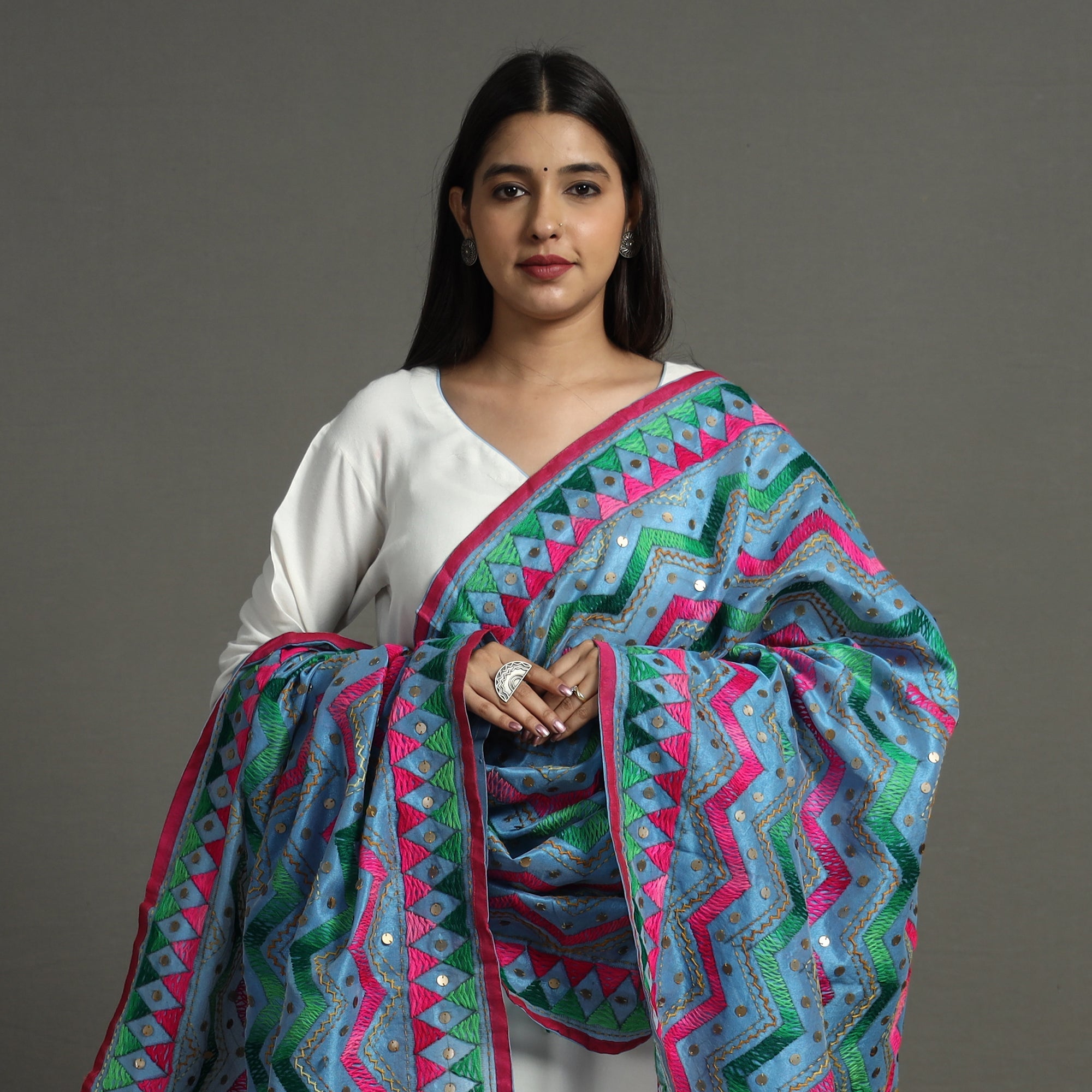 Phulkari is a supremely refined embroidery work practiced in the Punjab region. The meaning of the word phul is flower while Kari means to craft. It is the art of creating beautiful intricate designs and motifs on fabrics using different colored threads.