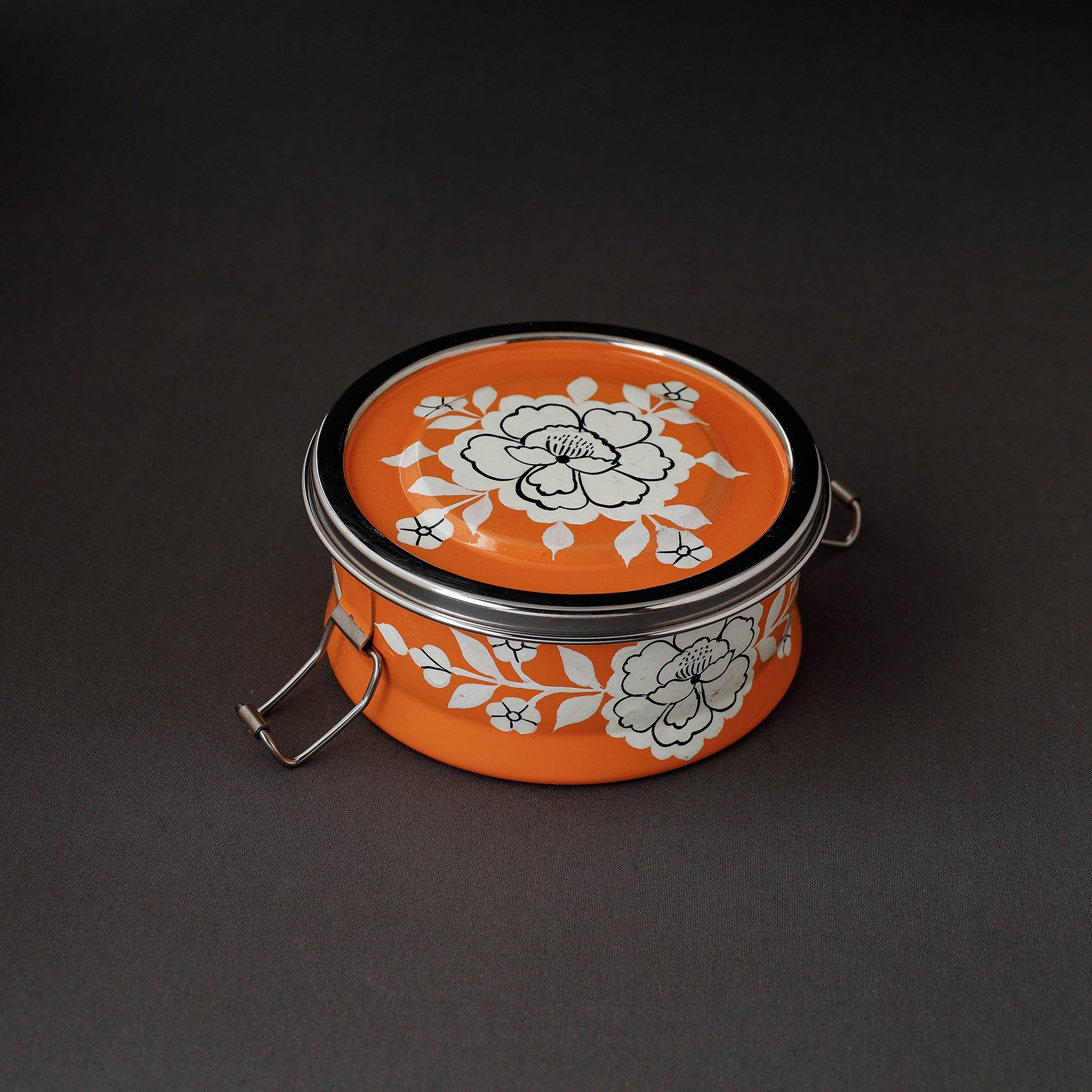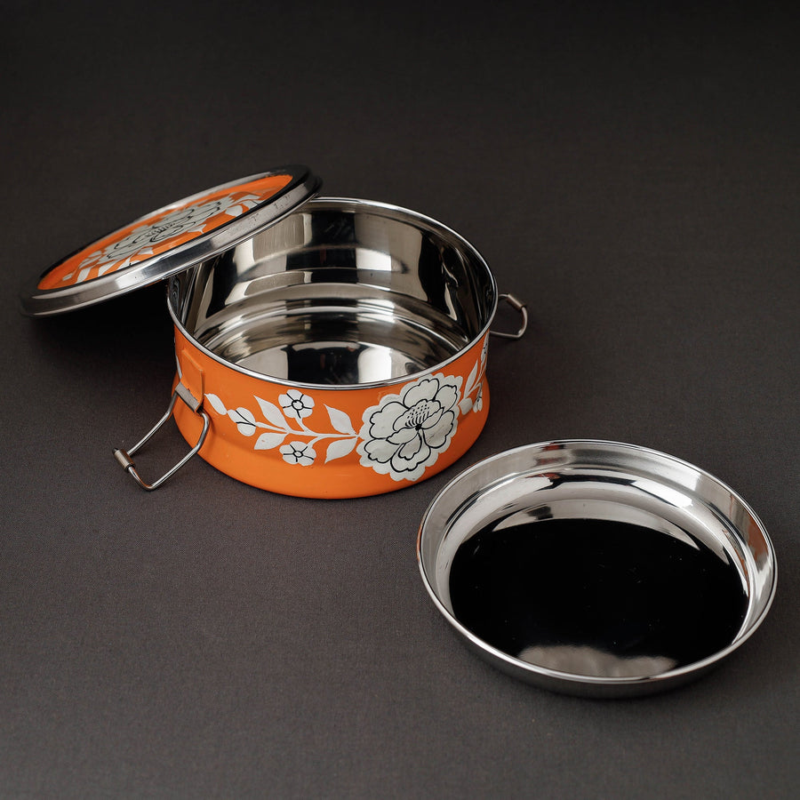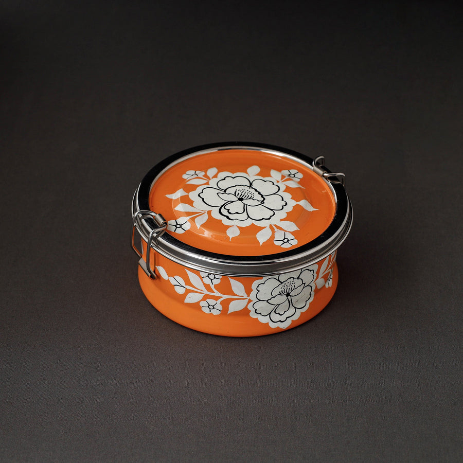 Floral design orange handpainted lunch box with waterproof oil based paint on very high quality stainless steel by the artisans of Kashmir. In this lunch box, you can easily store and carry your food.