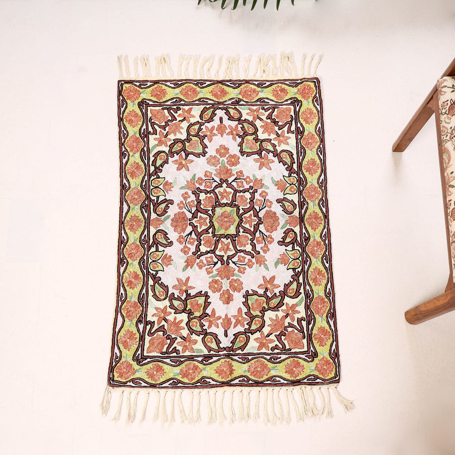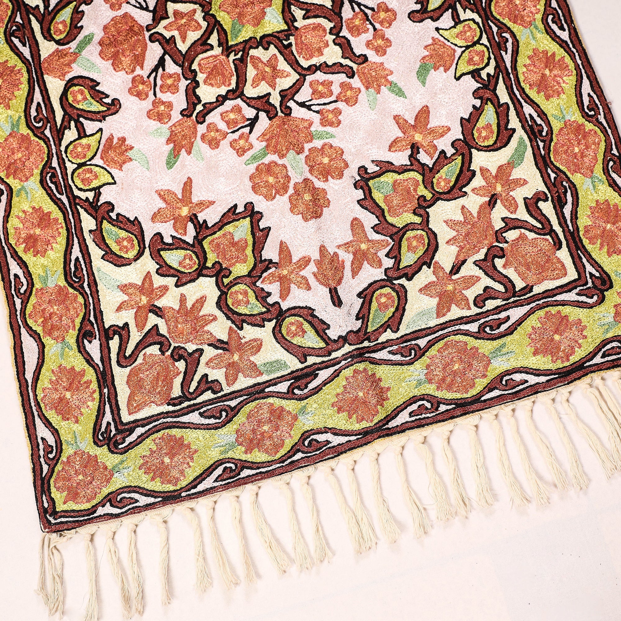 | Material | Add warmth and elegance to your home with this original chain stitch crewel mulberry silk thread hand embroidered rug/carpet. Made using traditional techniques from Kashmir, this exquisite rug features intricate crewel work using wool or silk yarn. The design is outlined with a wide variety of embroidery stitches, showcasing the beauty and natural elegance of silk. A timeless piece of art that adds a touch of luxury to any room in your home. |