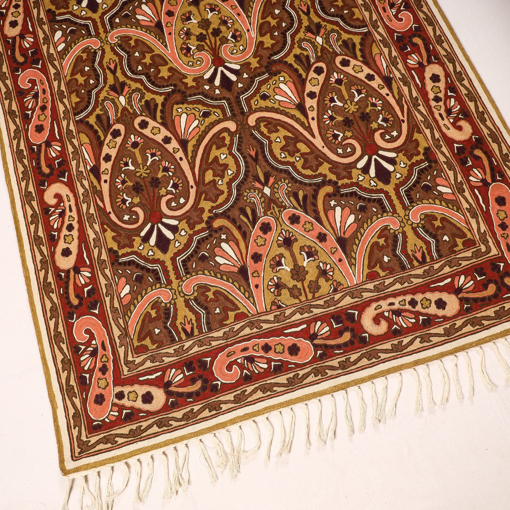 | Material | Add warmth and elegance to your home with this original chain stitch crewel wool thread hand embroidered rug/carpet. Made using traditional techniques from Kashmir, this exquisite rug features intricate crewel work using wool or silk yarn. The design is outlined with a wide variety of embroidery stitches, showcasing the beauty and natural elegance of silk. A timeless piece of art that adds a touch of luxury to any room in your home. |