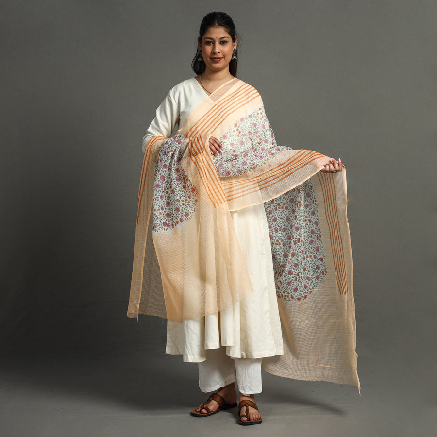 Fine quality sanganeri hand block printed kota doria cotton dupatta made using azo free dye colours. Sanganeri is a hand-block printed technique originating from Sanganer, a village in the southern part of Jaipur, Rajasthan. Kota doria is an age-old Indian textile produced in the Kota district of Rajasthan. The Doria or the threads are finely interweaves to make the check patterns. Its lightweight and sheer texture giving an exquisite grace and elegance of its own.