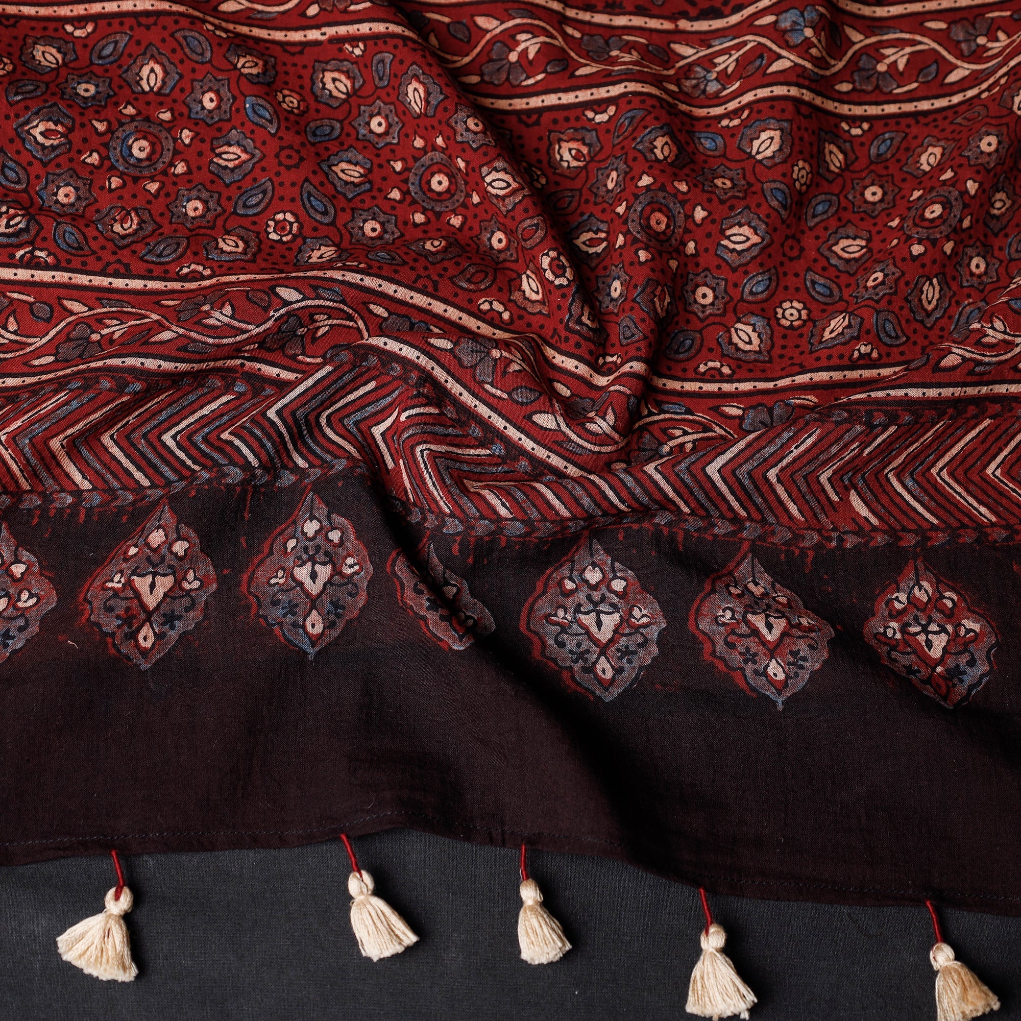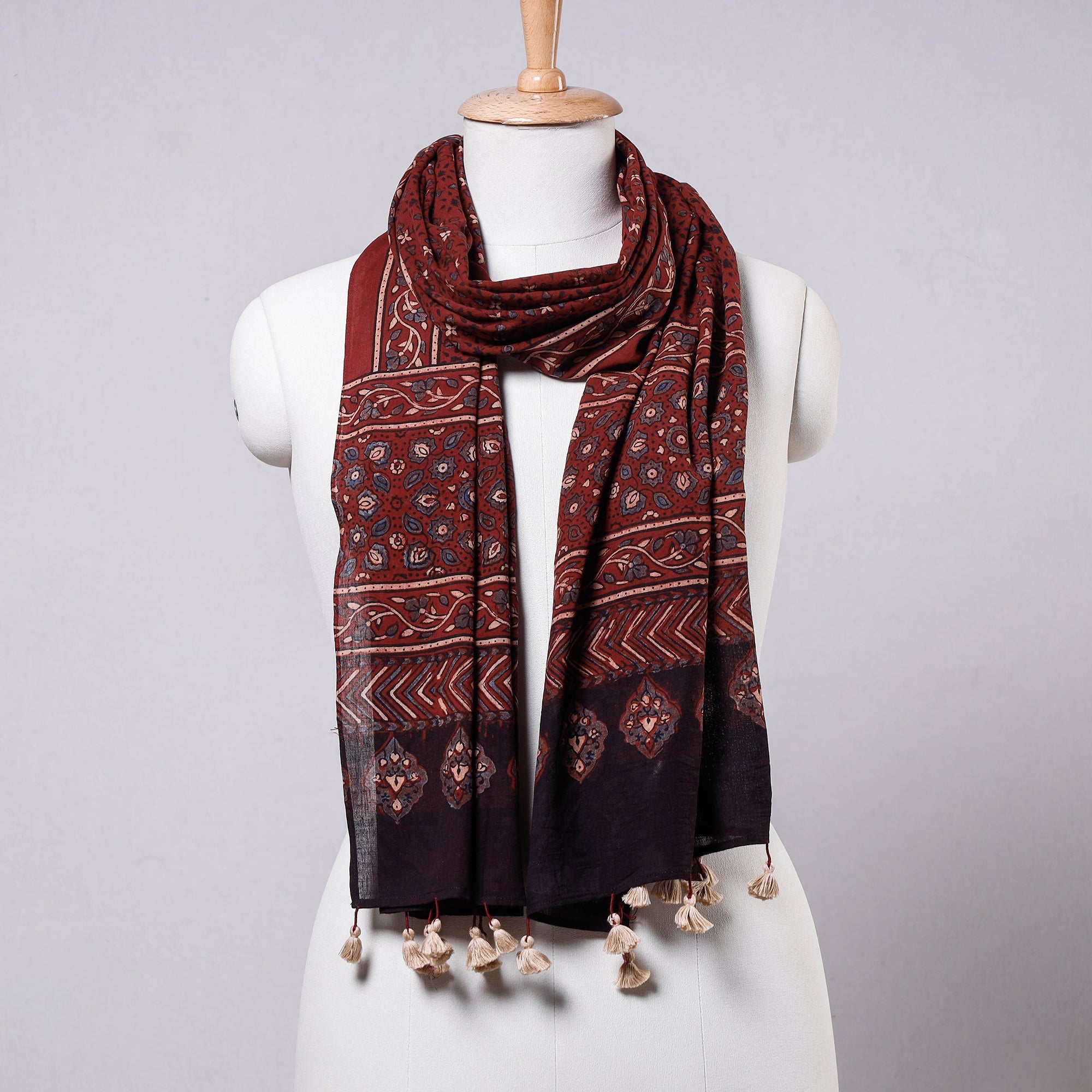 This is a beautiful red ajrakh block printed mul cotton stole with tassels, handcrafted by skilled artisans in the Kutch region of Gujarat using traditional techniques of hand block printing and natural dyes. Ajrakh is a unique style of block printing that originated in the Indus Valley civilization and is characterized by intricate geometric patterns and the use of natural dyes such as indigo and madder. The mul cotton fabric is lightweight and breathable, making this stole perfect for any season. The tassels add a playful touch to this elegant accessory.
