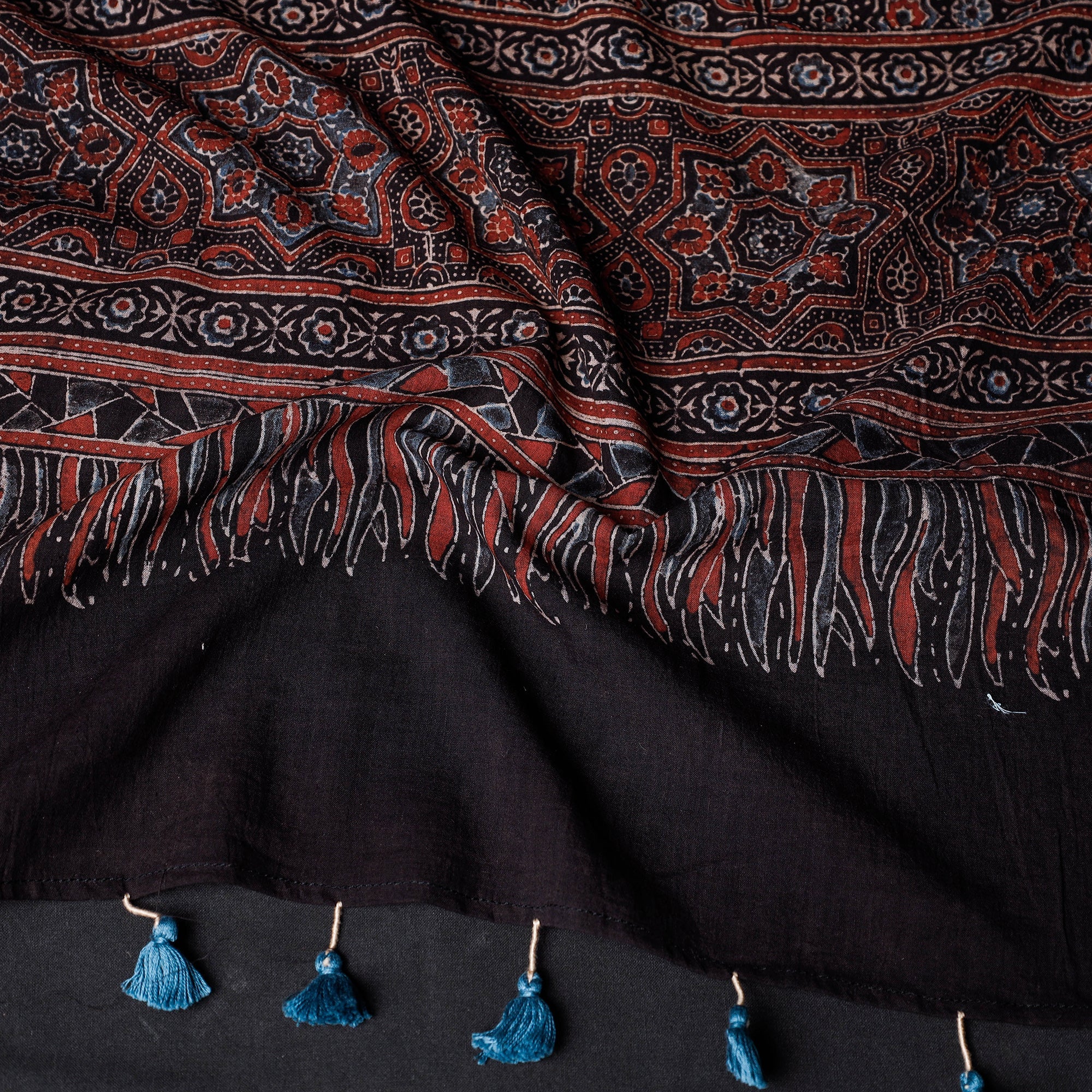 This is a beautiful black ajrakh block printed mul cotton stole with tassels, handcrafted by skilled artisans in the Kutch region of Gujarat using traditional techniques of hand block printing and natural dyes. Ajrakh is a unique style of block printing that originated in the Indus Valley civilization and is characterized by intricate geometric patterns and the use of natural dyes such as indigo and madder. The mul cotton fabric is lightweight and breathable, making this stole perfect for any season. The tassels add a playful touch to this elegant accessory.