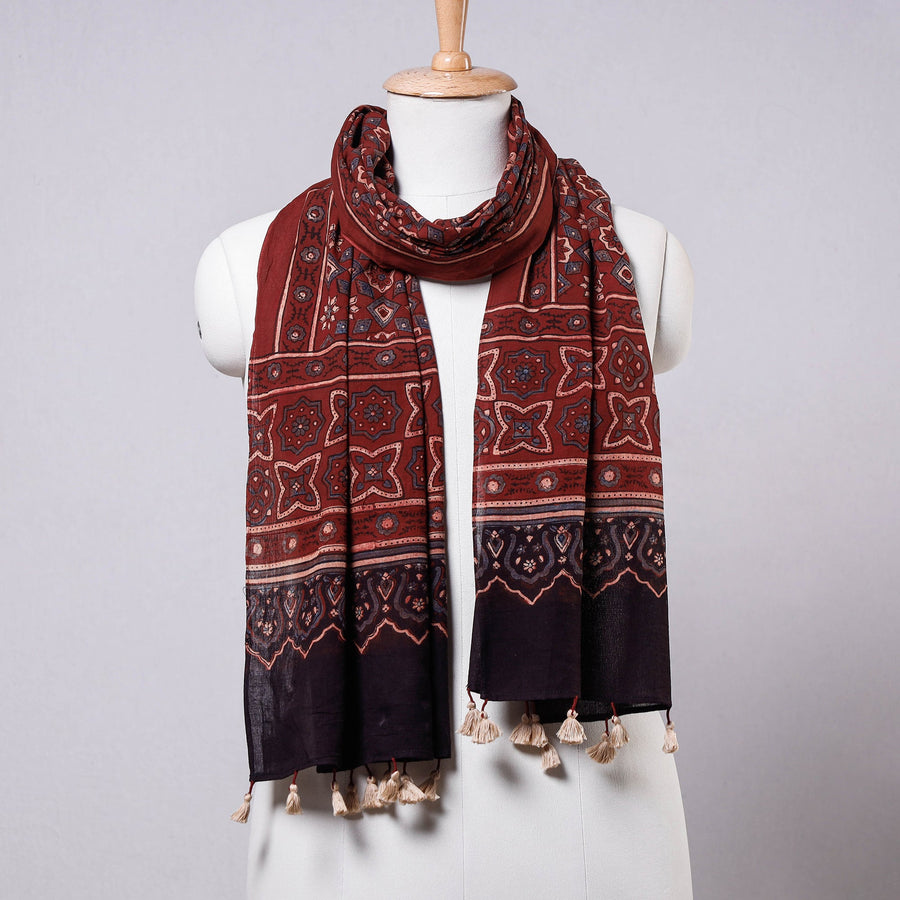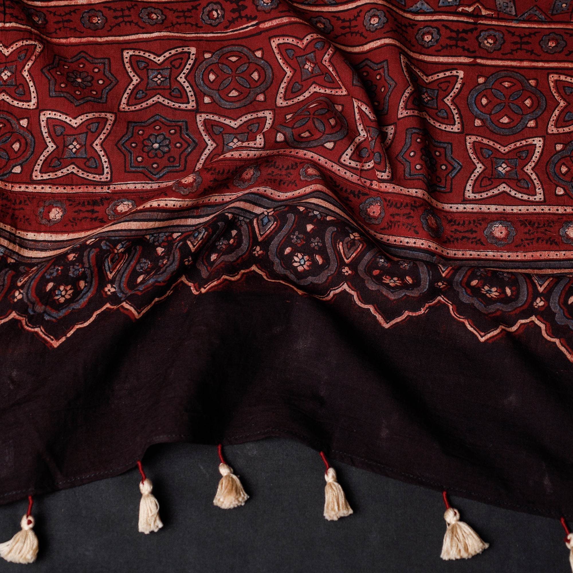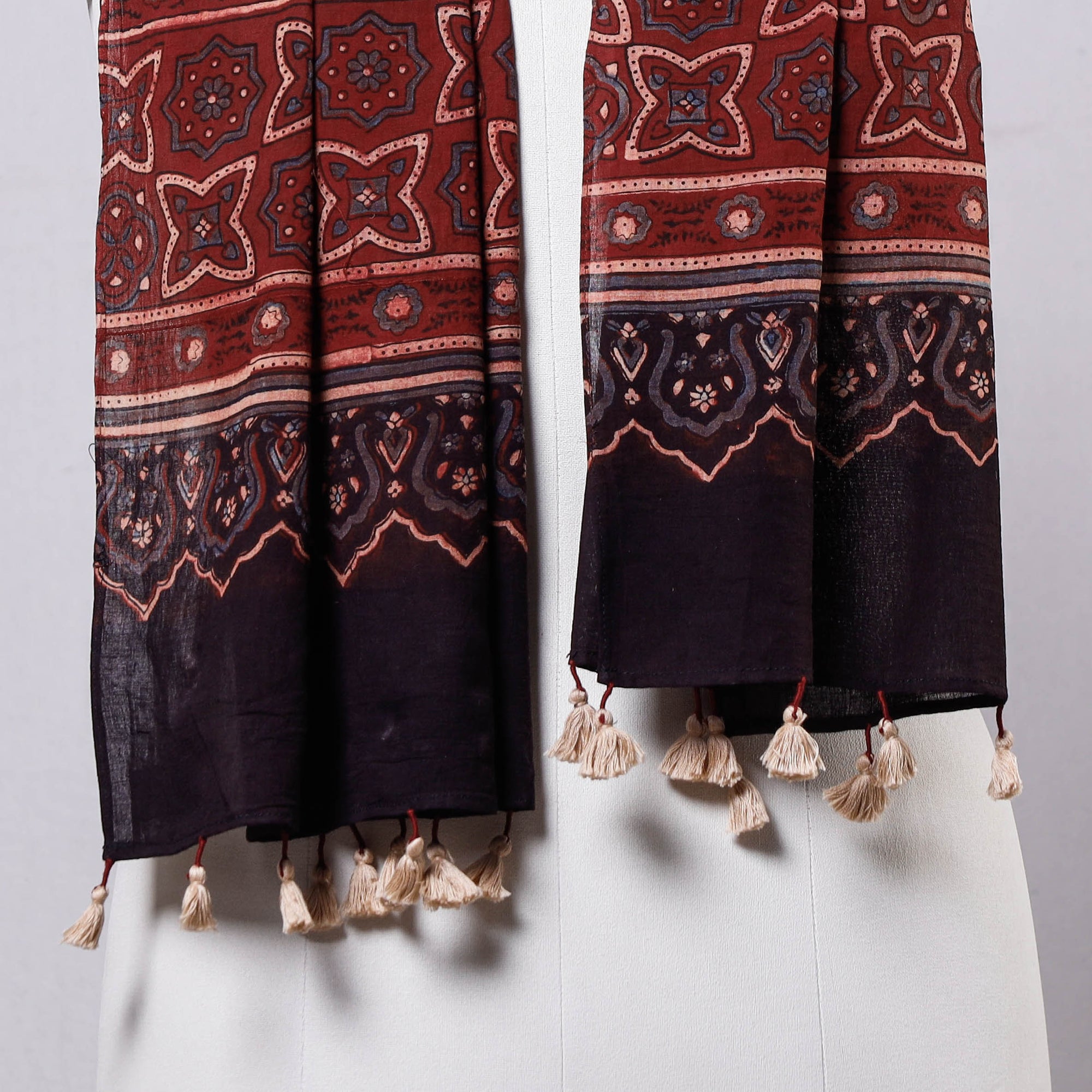 This is a beautiful red ajrakh block printed mul cotton stole with tassels, handcrafted by skilled artisans in the Kutch region of Gujarat using traditional techniques of hand block printing and natural dyes. Ajrakh is a unique style of block printing that originated in the Indus Valley civilization and is characterized by intricate geometric patterns and the use of natural dyes such as indigo and madder. The mul cotton fabric is lightweight and breathable, making this stole perfect for any season. The tassels add a playful touch to this elegant accessory.