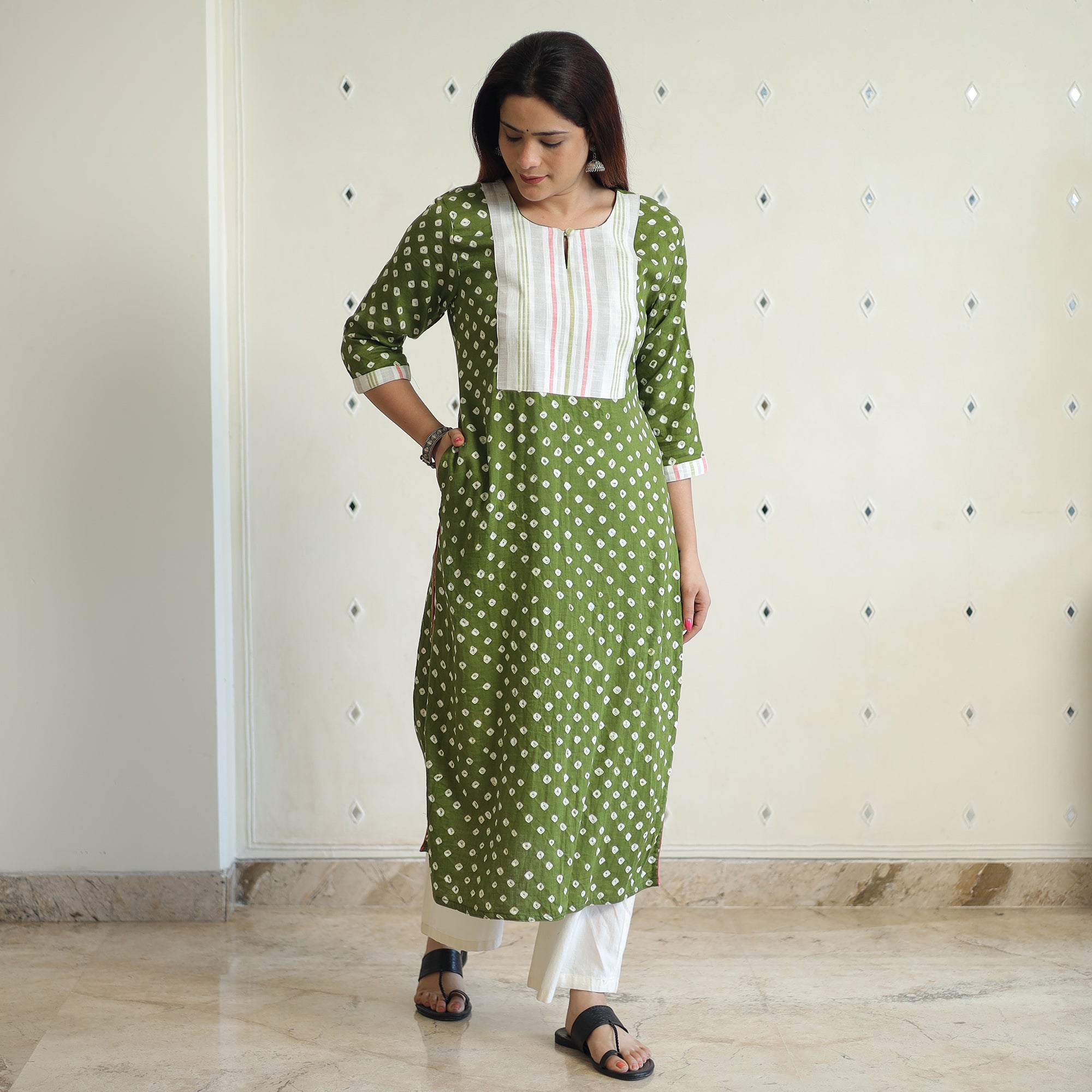 Look and feel beautiful in this uniquely designed bandhani tie-dye cotton long kurta with a jacquard cotton patch and one side pocket. This cotton kurta makes you comfortable with ease all day long. This kurta is perfect for your daily outing and for a special occasion. Bandhani is a tie-dyed soft cotton fabric featuring the majestic bandhani pattern, tie-dyed using the traditional technique practised by skilled artisans and their families in Kutch.
