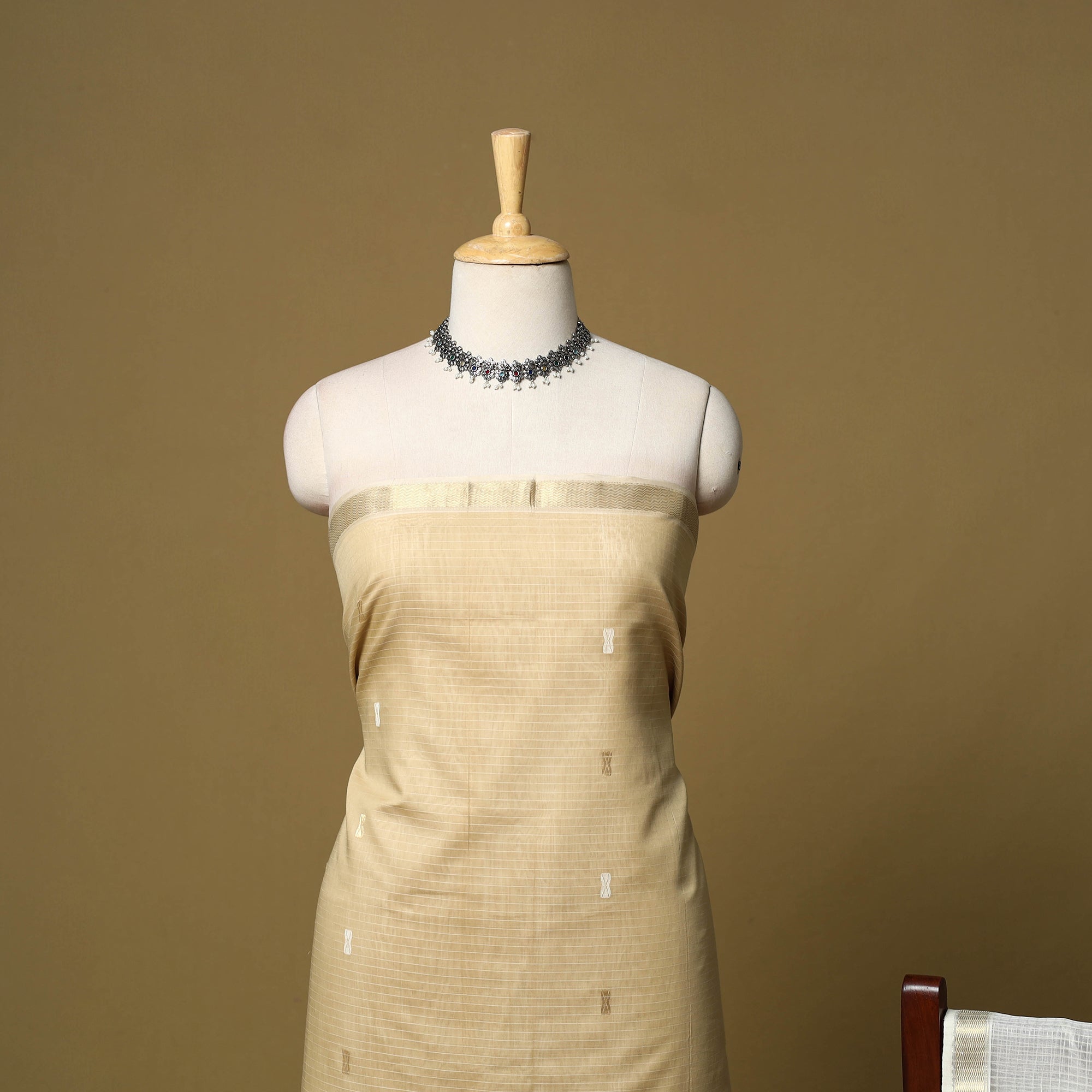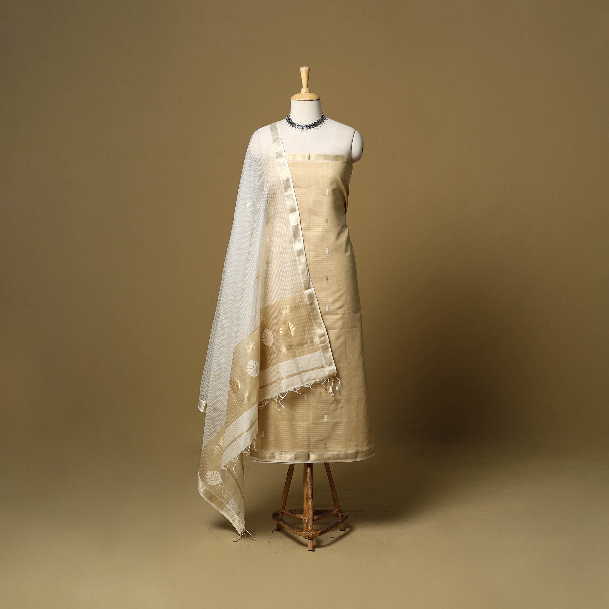 This is a beautiful beige chanderi silk cotton 3-piece suit material set, skillfully handloomed by master artisan Rauph Khan in the historic town of Chanderi, Madhya Pradesh. The intricate zari weaving adds a touch of elegance to this gossamer-like fabric. The butis or motifs on the chanderi blend are handwoven using separate needles, resulting in a unique and intricate pattern. This set is perfect for any special occasion, and its amazing feel and texture will make you stand out.