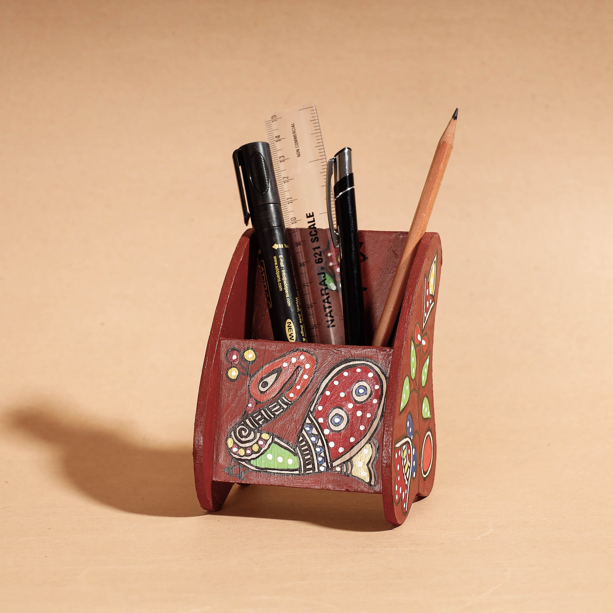 This MDF wooden pen stand is a unique piece of art, featuring beautifully hand-painted Madhubani motifs in vibrant fabric colours. Expertly crafted by master artisan Hira Devi from Bihar, this pen stand is both functional and visually stunning, making it a great addition to any desk or workspace.