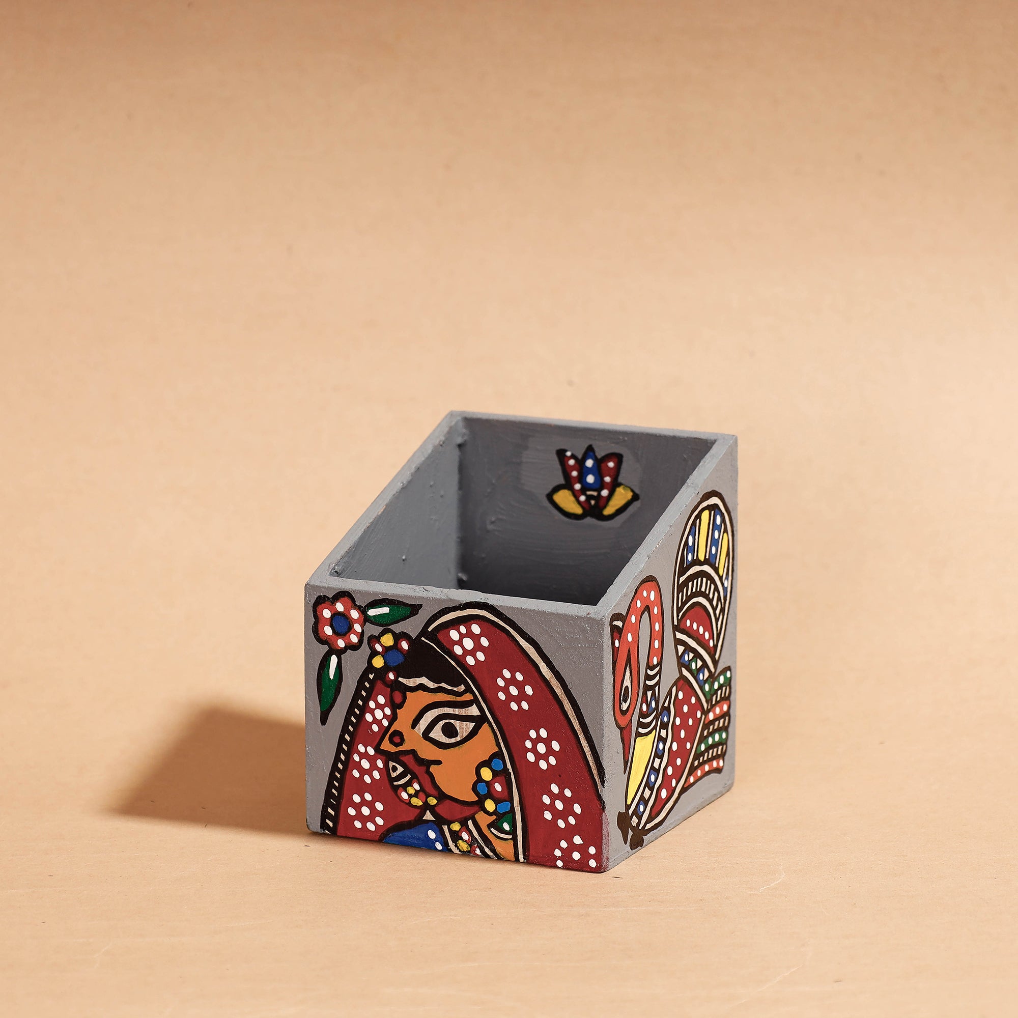 This MDF wooden pen stand is a unique piece of art, featuring beautifully hand-painted Madhubani motifs in vibrant fabric colours. Expertly crafted by master artisan Hira Devi from Bihar, this pen stand is both functional and visually stunning, making it a great addition to any desk or workspace.