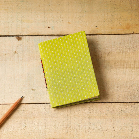 | Material | This hardbound notebook features a cover made of green kantha stitch cotton fabric with handmade paper pages. The paper is eco-friendly, made from recycled cotton, paper, and other natural fiber waste without the use of chemicals. Master artisans handcraft each notebook with attention to detail using traditional bookbinding techniques. |