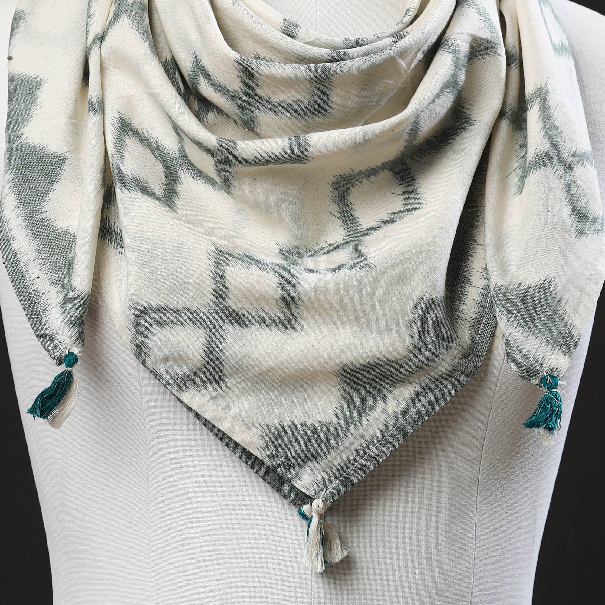 This is a white handloom Maniabandha Ikat cotton scarf woven by master weavers in Odisha, India. Ikat is a resist dyeing technique used to create patterns on textiles. The scarf features lovely patterns and is known for its beautiful colors, textures, and designs. Indian Ikat is highly sought-after by fashion designers worldwide.