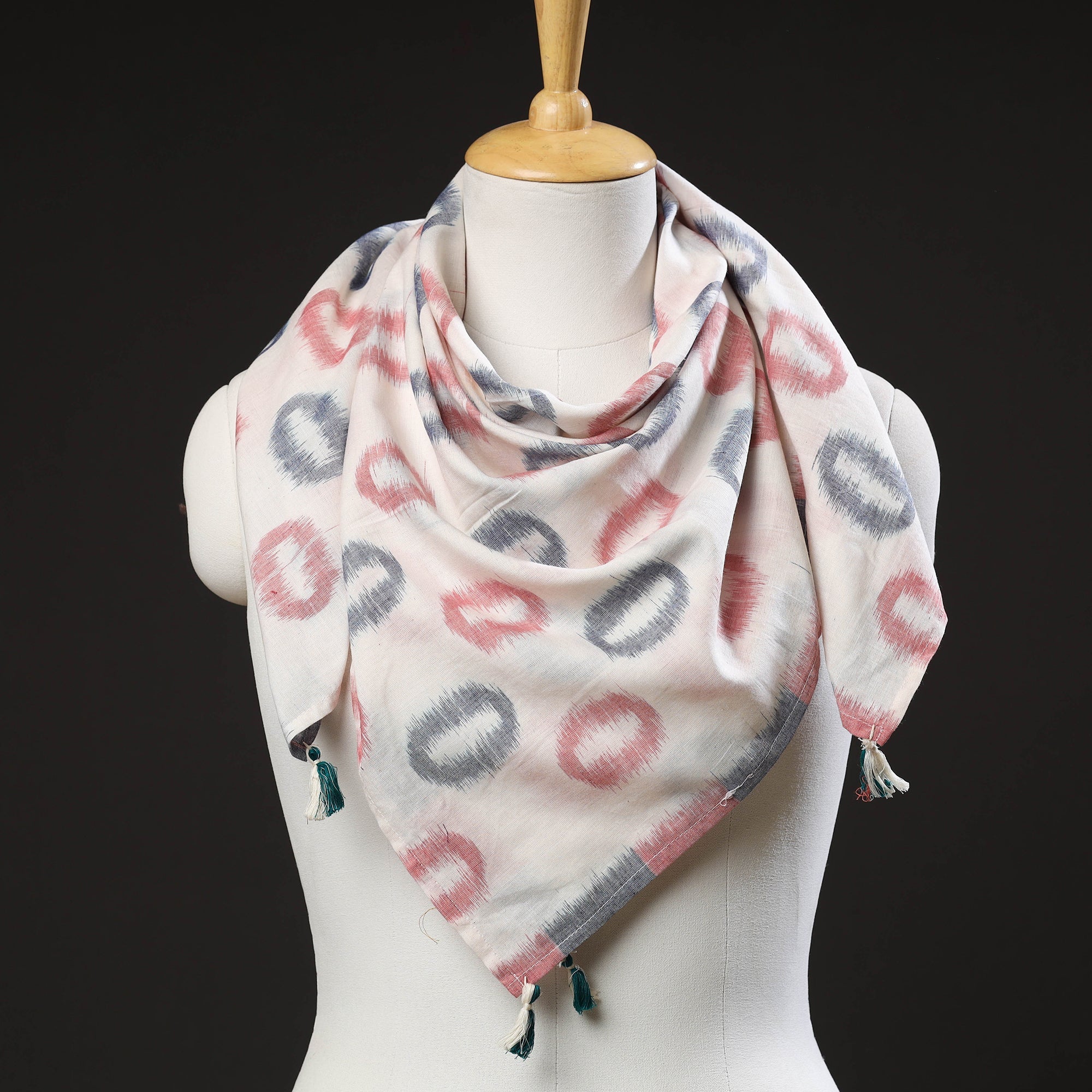 This is a white handloom Maniabandha Ikat cotton scarf woven by master weavers in Odisha, India. Ikat is a resist dyeing technique used to create patterns on textiles. The scarf features lovely patterns and is known for its beautiful colors, textures, and designs. Indian Ikat is highly sought-after by fashion designers worldwide.
