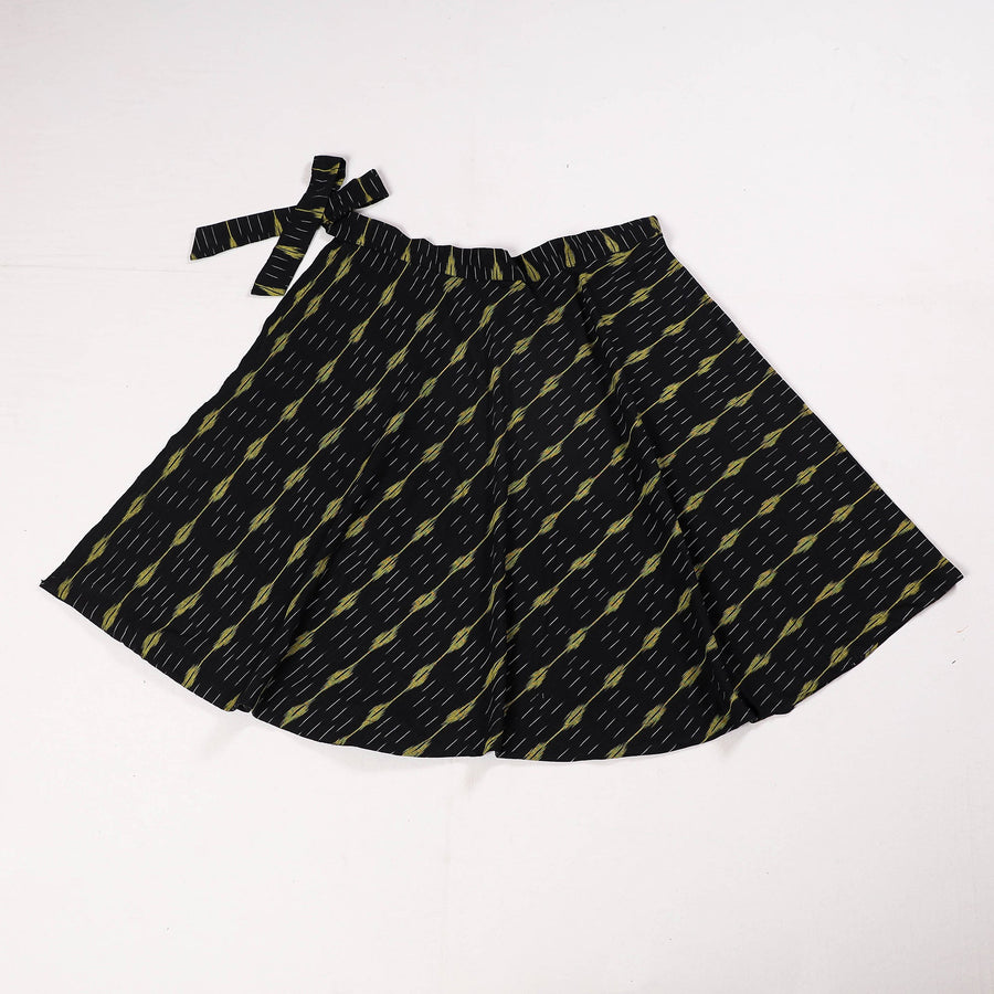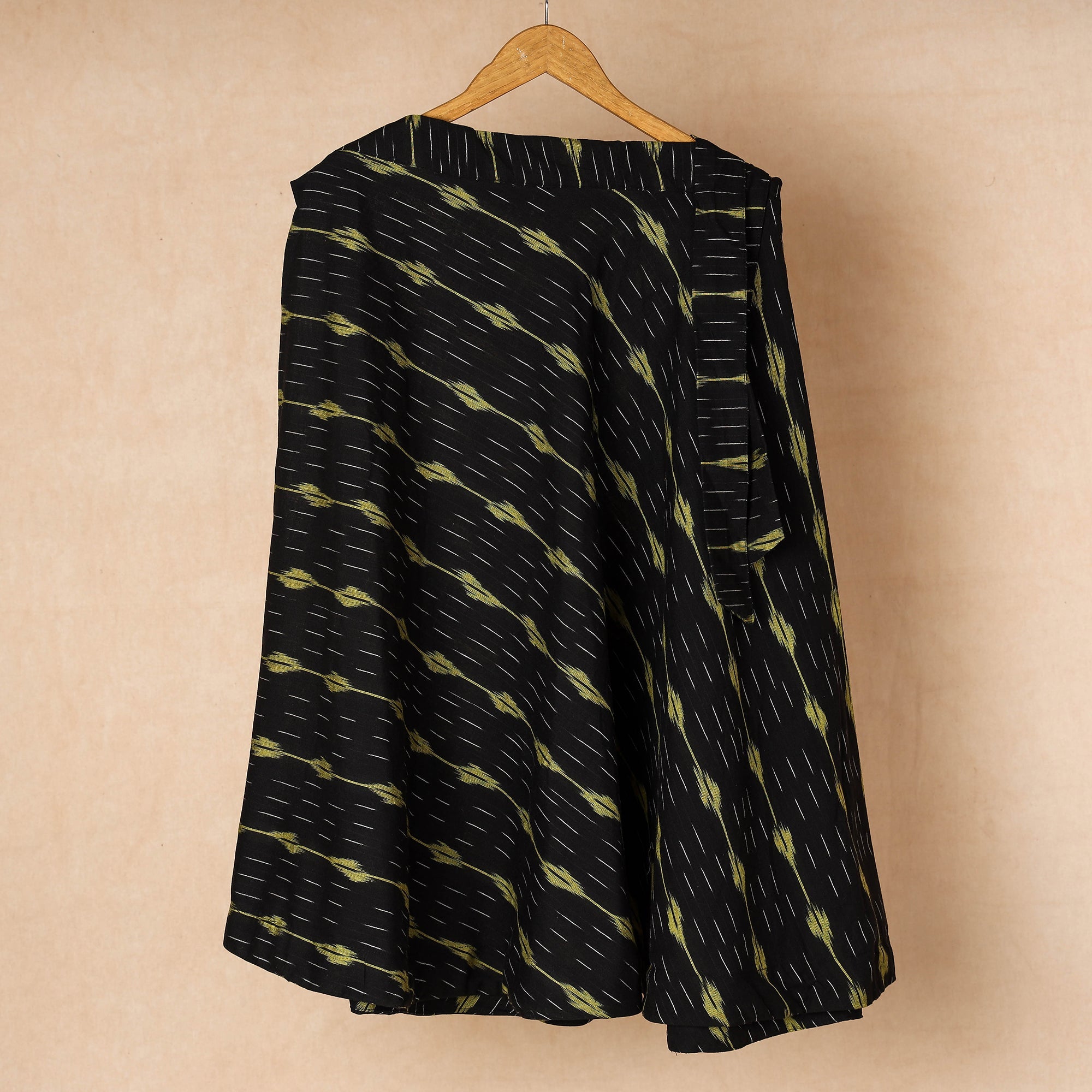 Elevate your style with this fine quality black pochampally ikat weave pure cotton wrap around skirt. Featuring a waist tie-up closure, this skirt is not only stylish but also comfortable to wear. The ikat (ikkat) dyeing technique used in this skirt creates beautiful patterns and designs, making it a standout piece in your wardrobe. Ikat is known for its unique and vibrant colors, as well as its texture and intricate designs. Indian ikat has always been admired by fashion designers worldwide for its rich heritage and timeless appeal. Step out in style with this exquisite pochampally ikat wrap around skirt that showcases the beauty of traditional Indian textiles and craftsmanship.