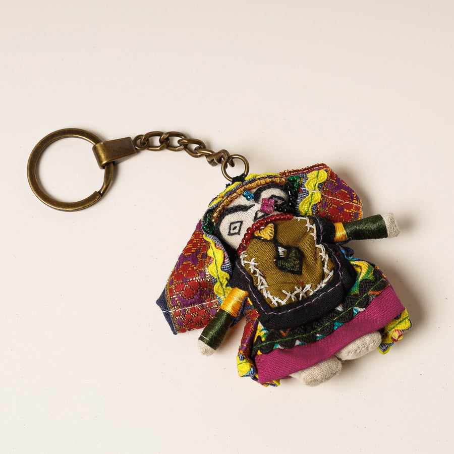 Fine quality traditional kutch embroidery handmade doll keychain. This doll keychain is often made from small pieces of waste fabrics called thigdas. They are usually made by women from traditional Kutchi families living in the interiors of Kutch. This doll keychain is stuffed with fabrics.