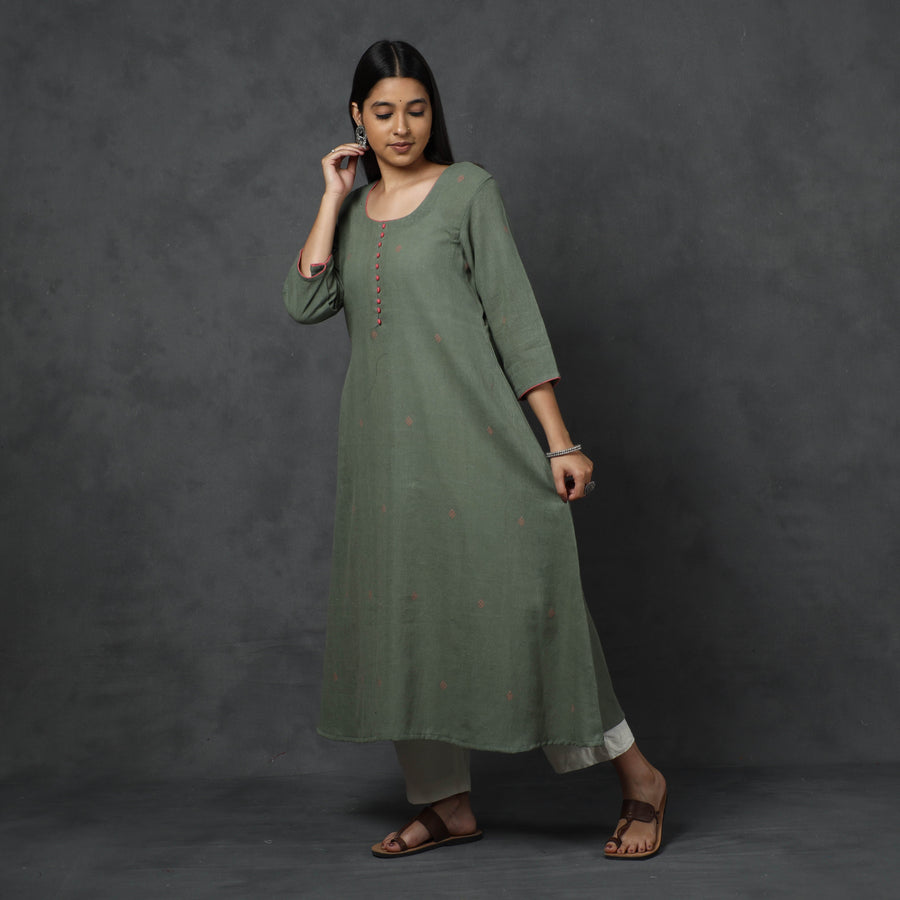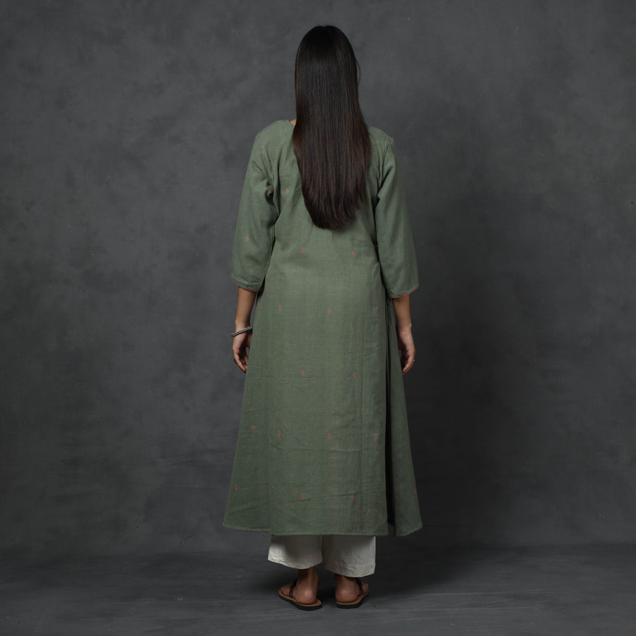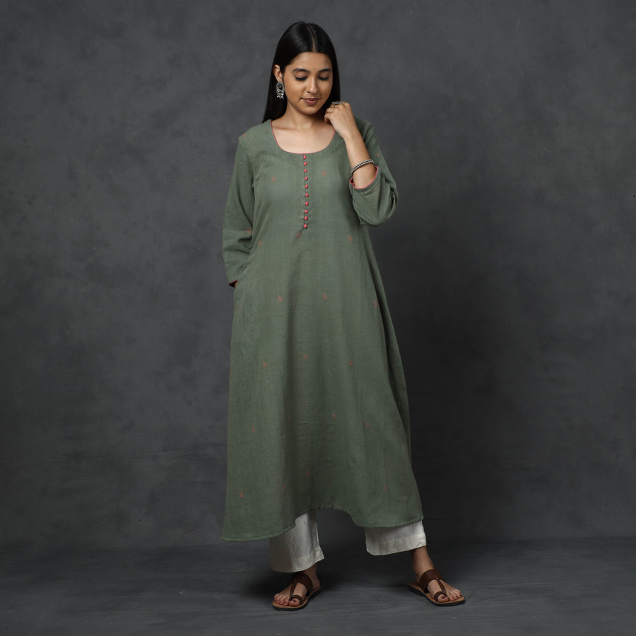 This organic kala cotton handloom long Kurta is uniquely designed with buti and comes with a one-side pocket. Made from comfortable cotton material, it ensures all-day comfort. Look and feel beautiful while wearing this stylish and practical Kurta.