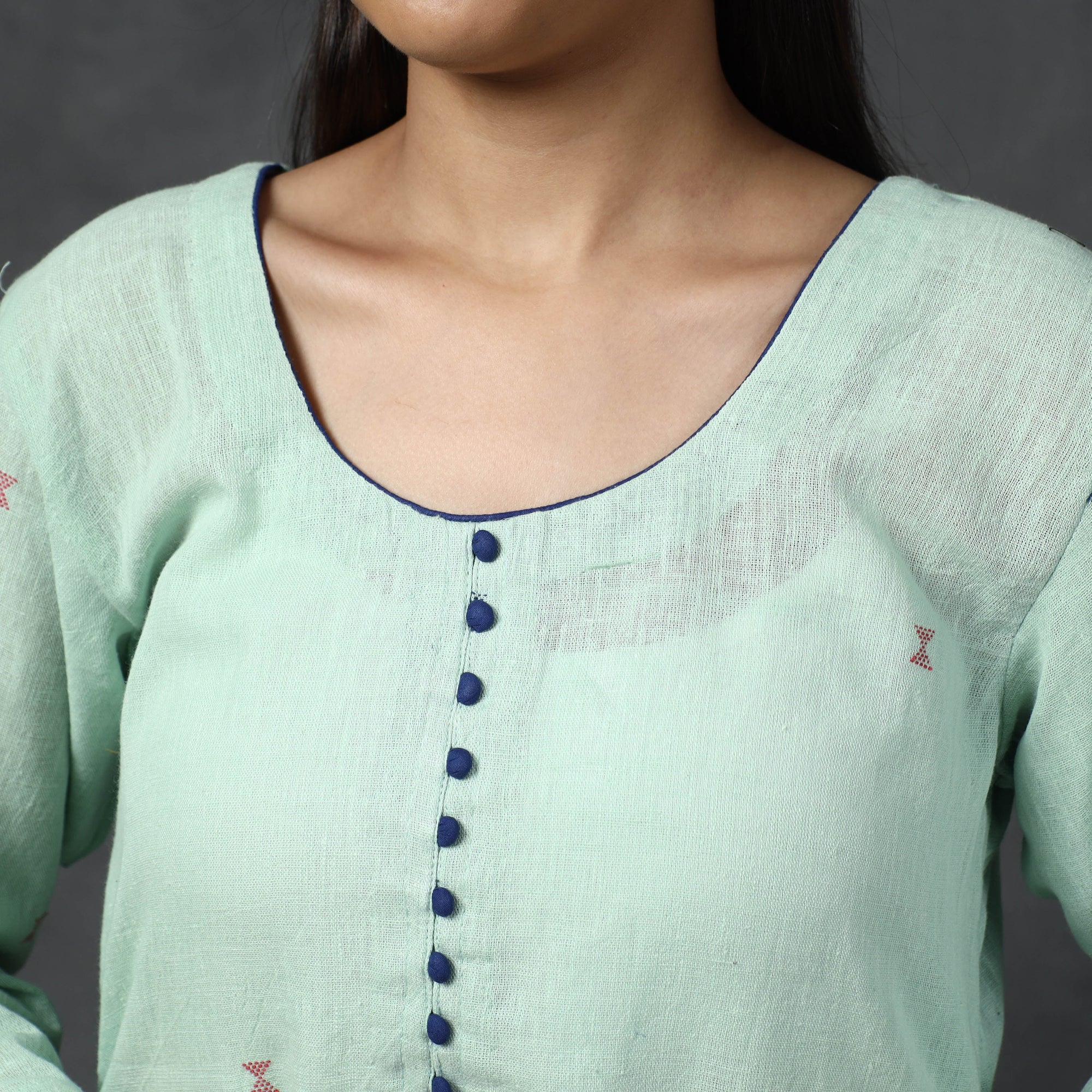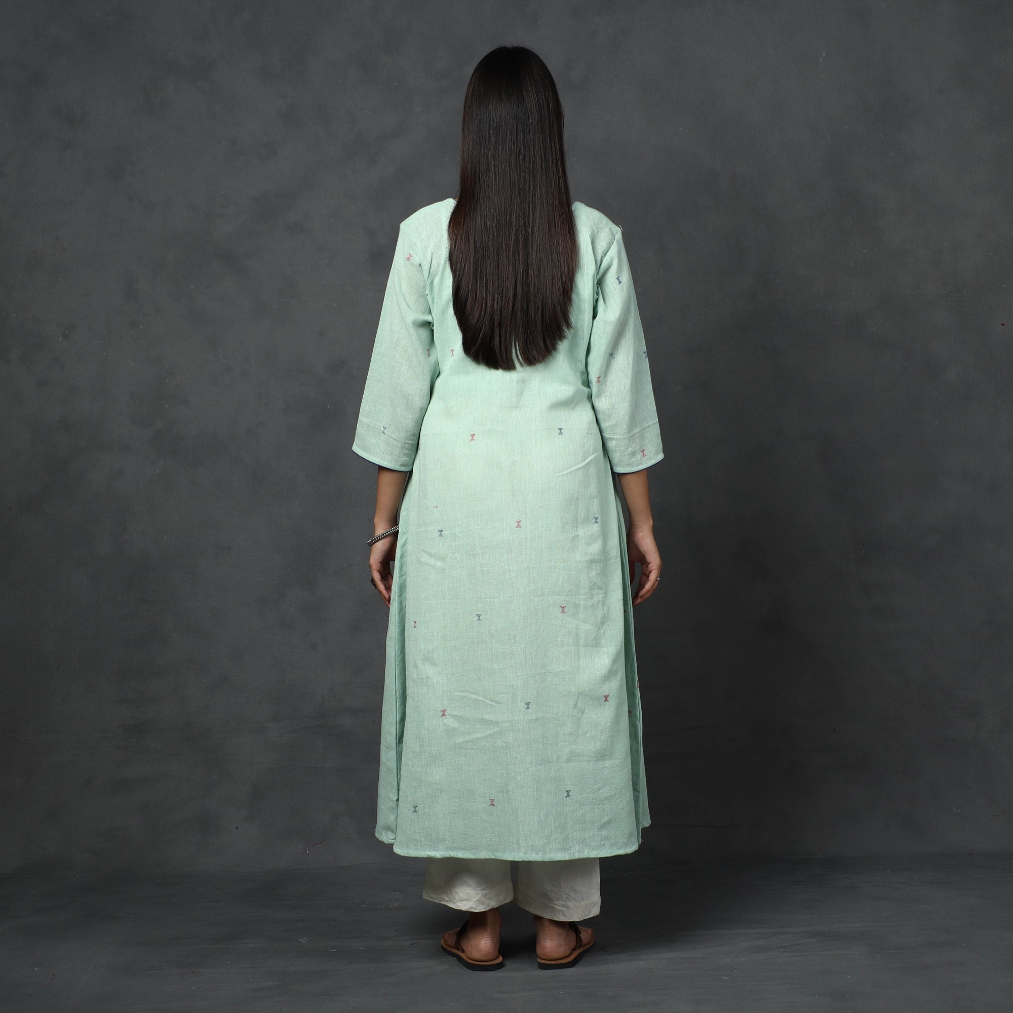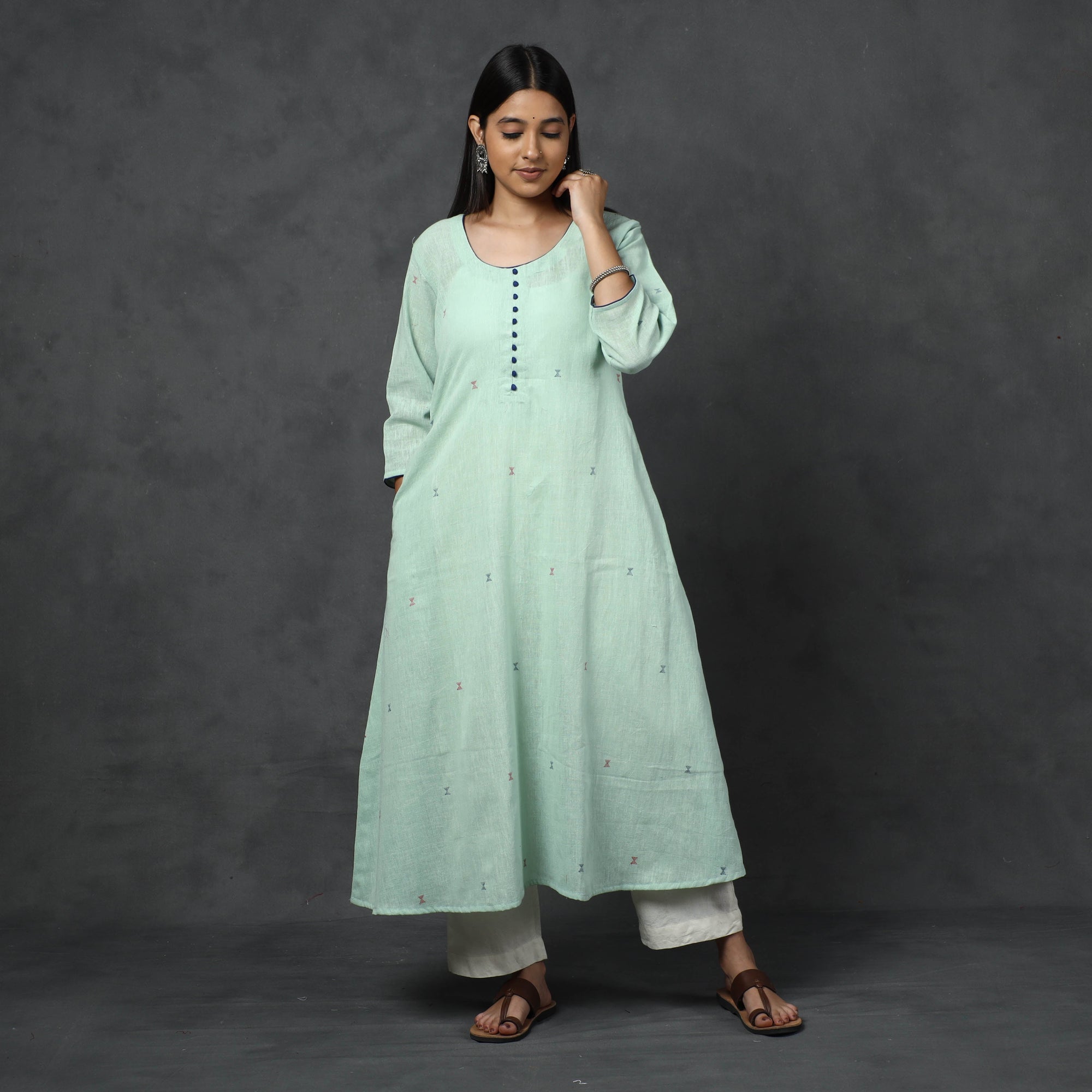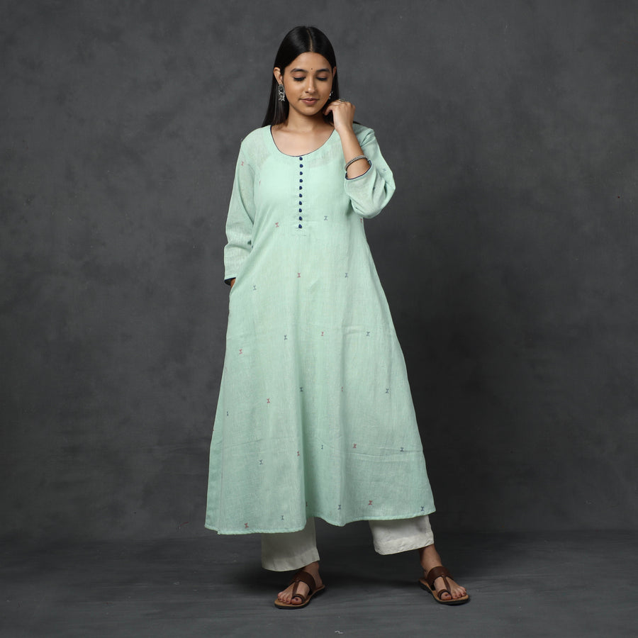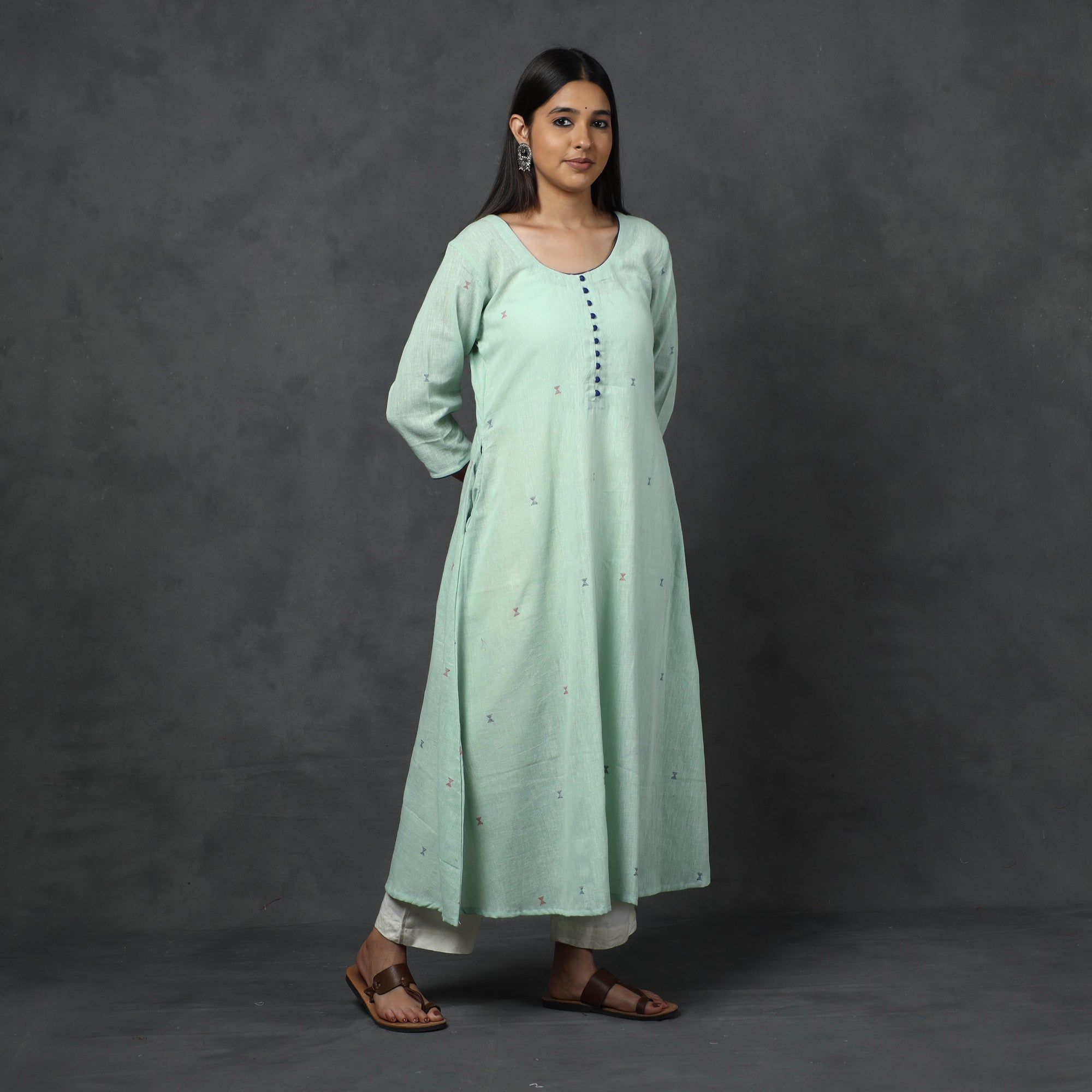 This organic kala cotton handloom long kurta is uniquely designed with buti and comes with a one-side pocket. Made from comfortable cotton material, it ensures all-day comfort. Look and feel beautiful while wearing this stylish and practical kurta.