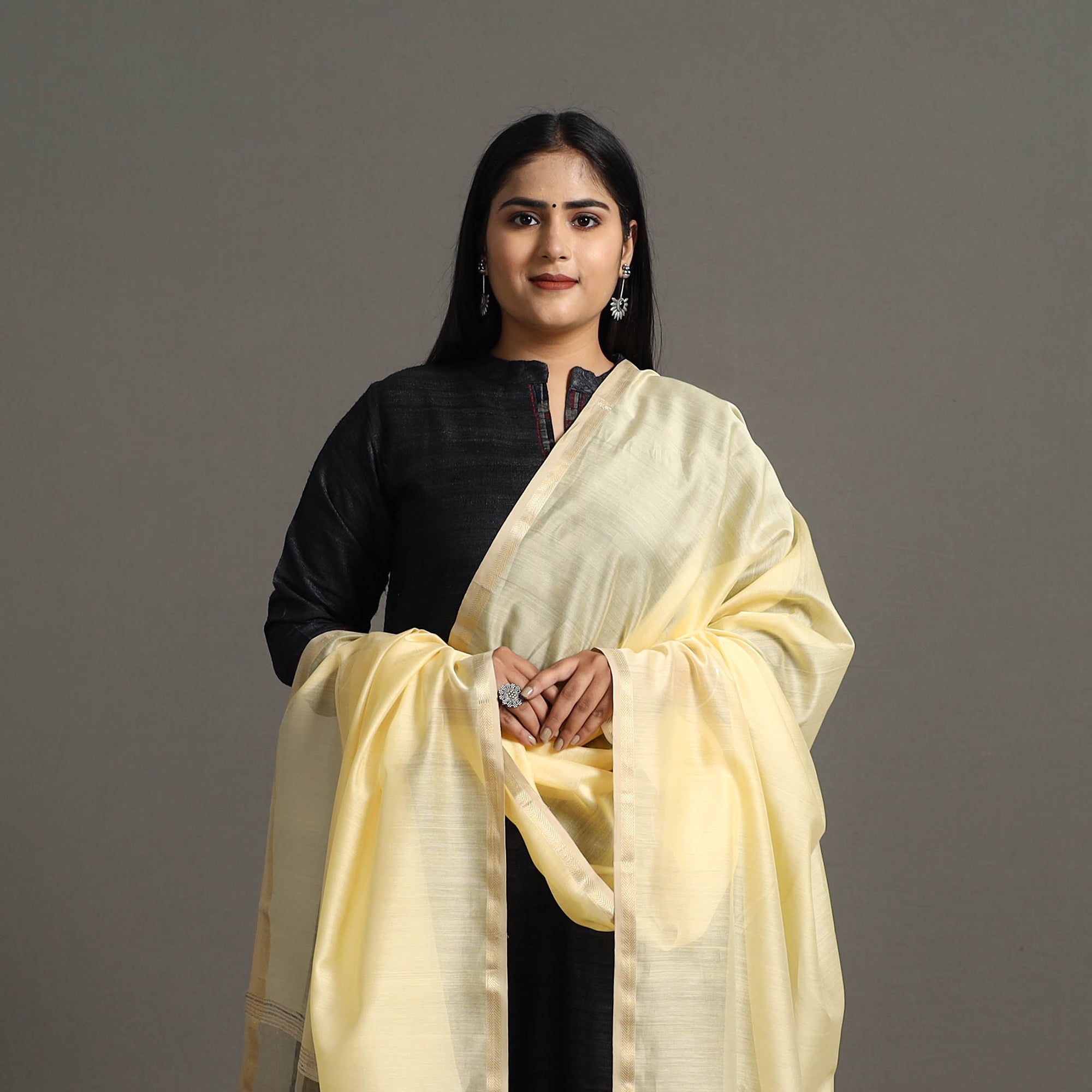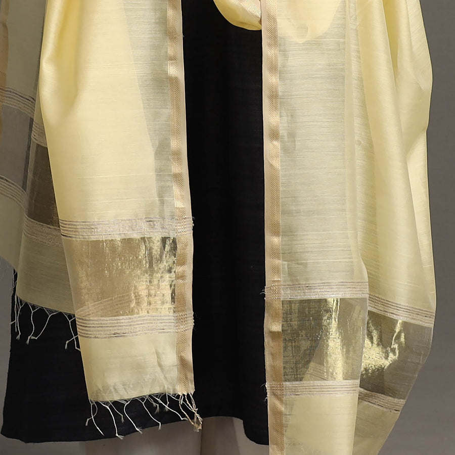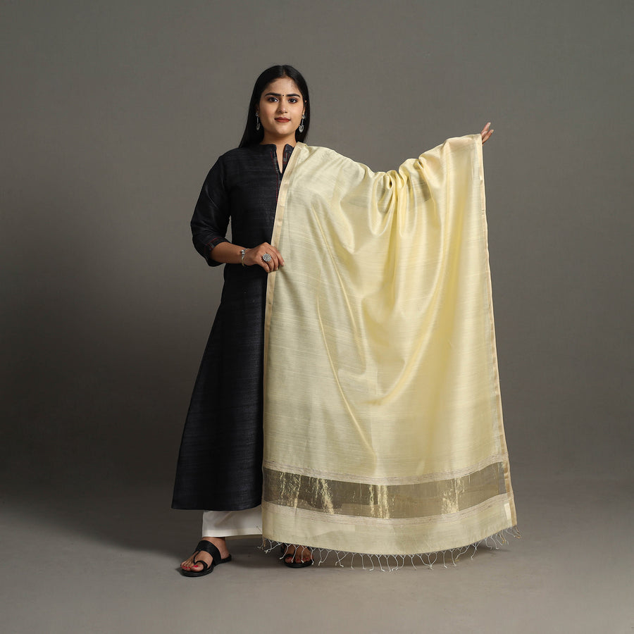 This light yellow Maheshwari silk-cotton handloom dupatta with tassels is a masterpiece of traditional weaving techniques passed down through generations of skilled artisans in Maheshwar. Its lightweight, sheer texture exudes unparalleled elegance, adding grace to any attire. With its exquisite craftsmanship and delicate tassels, this dupatta is a must-have for anyone who appreciates the art of handloom weaving.