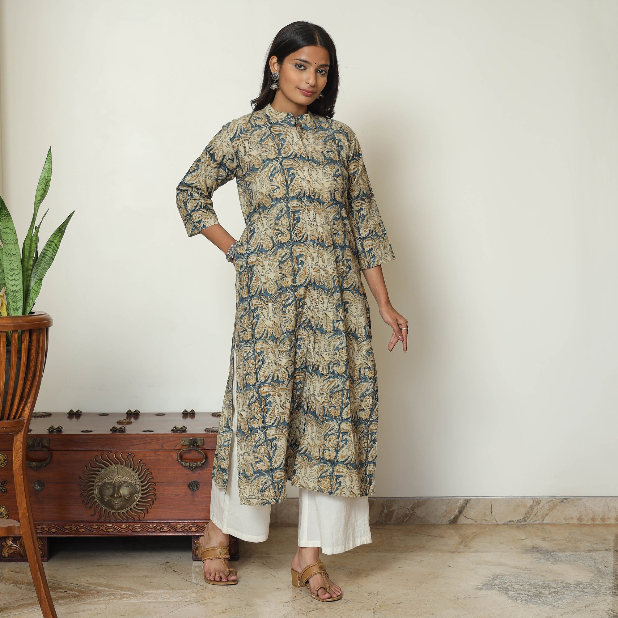 Look and feel beautiful in this uniquely designed blue block printed natural dyed cotton long kalamkari kurta with side pocket. This cotton kurta makes you comfortable with ease all day long. This kurta is perfect for your daily outing and for a special occasion.