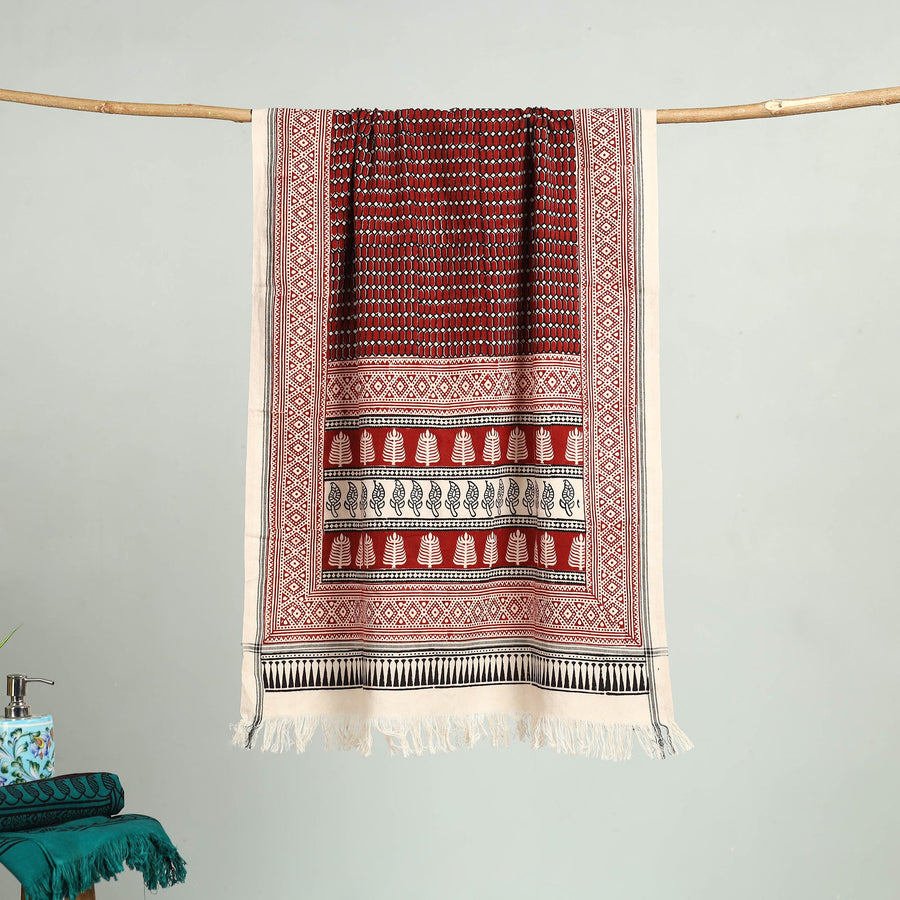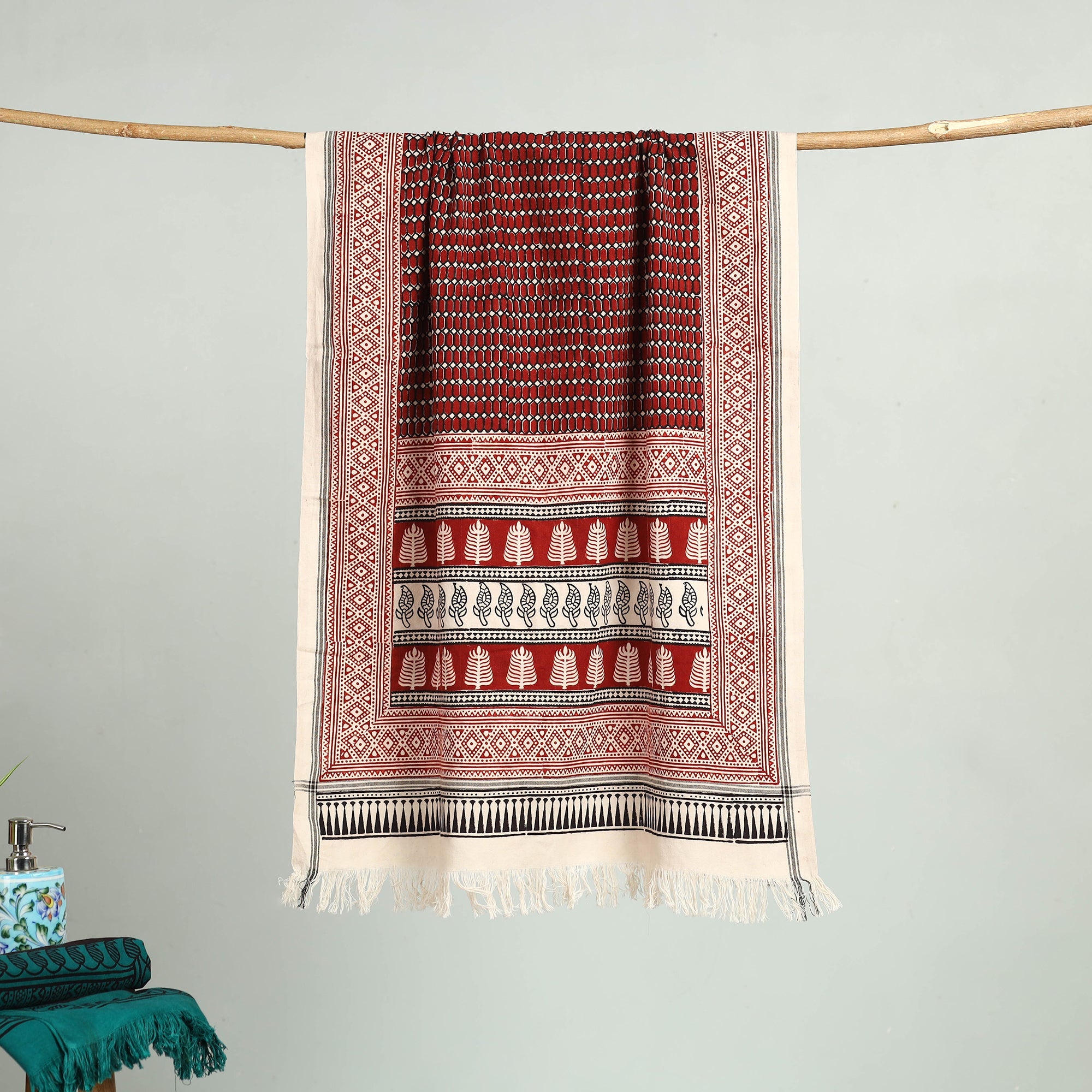Indulge in the soft comfort and artistic beauty of the fine quality red bagh hand block printed pure handloom cotton towel. This exquisite towel is meticulously crafted using traditional techniques by master artisan Umar Faruk Khatri, who practices the art of bagh hand block printing in Bagh, the Dhar district of Madhya Pradesh.
