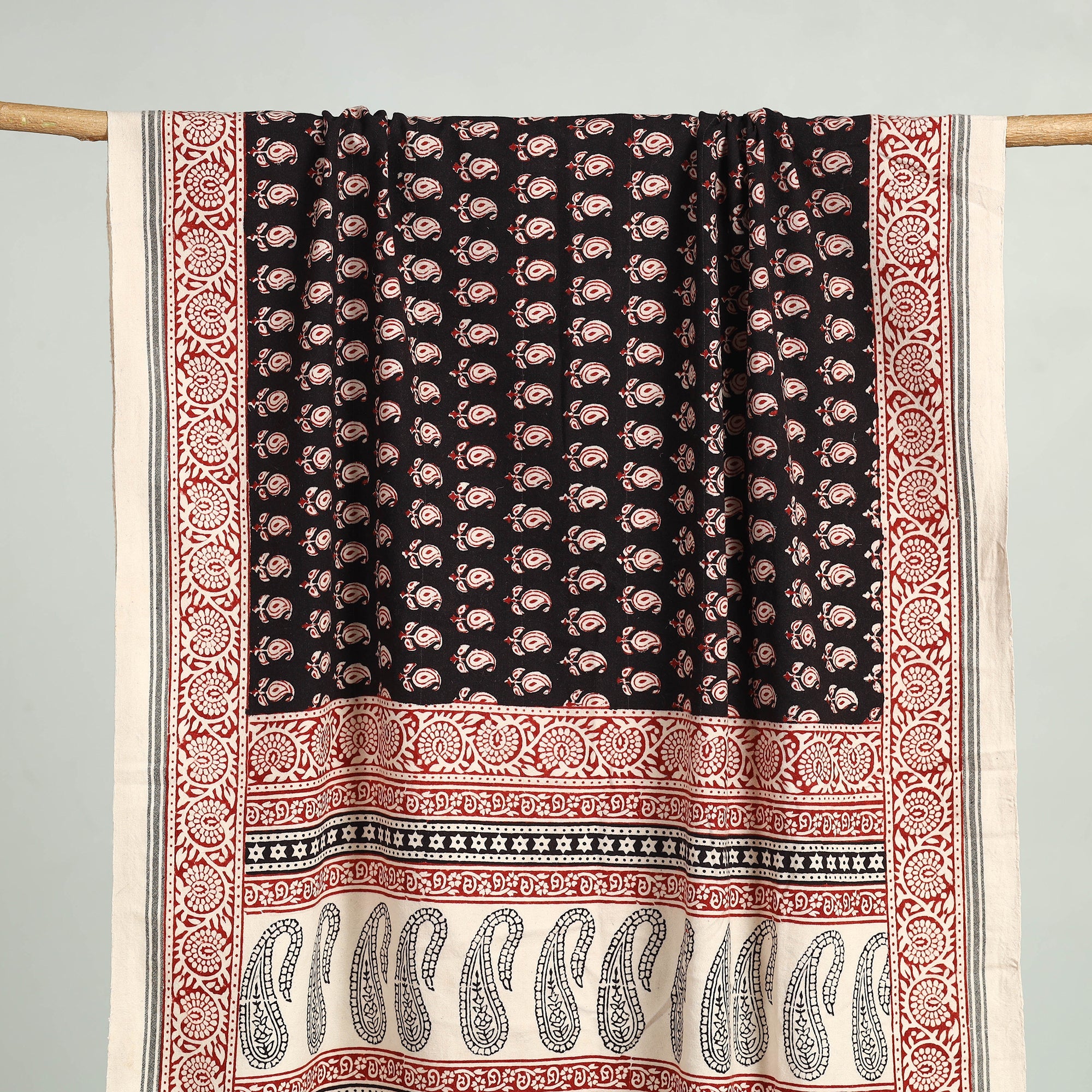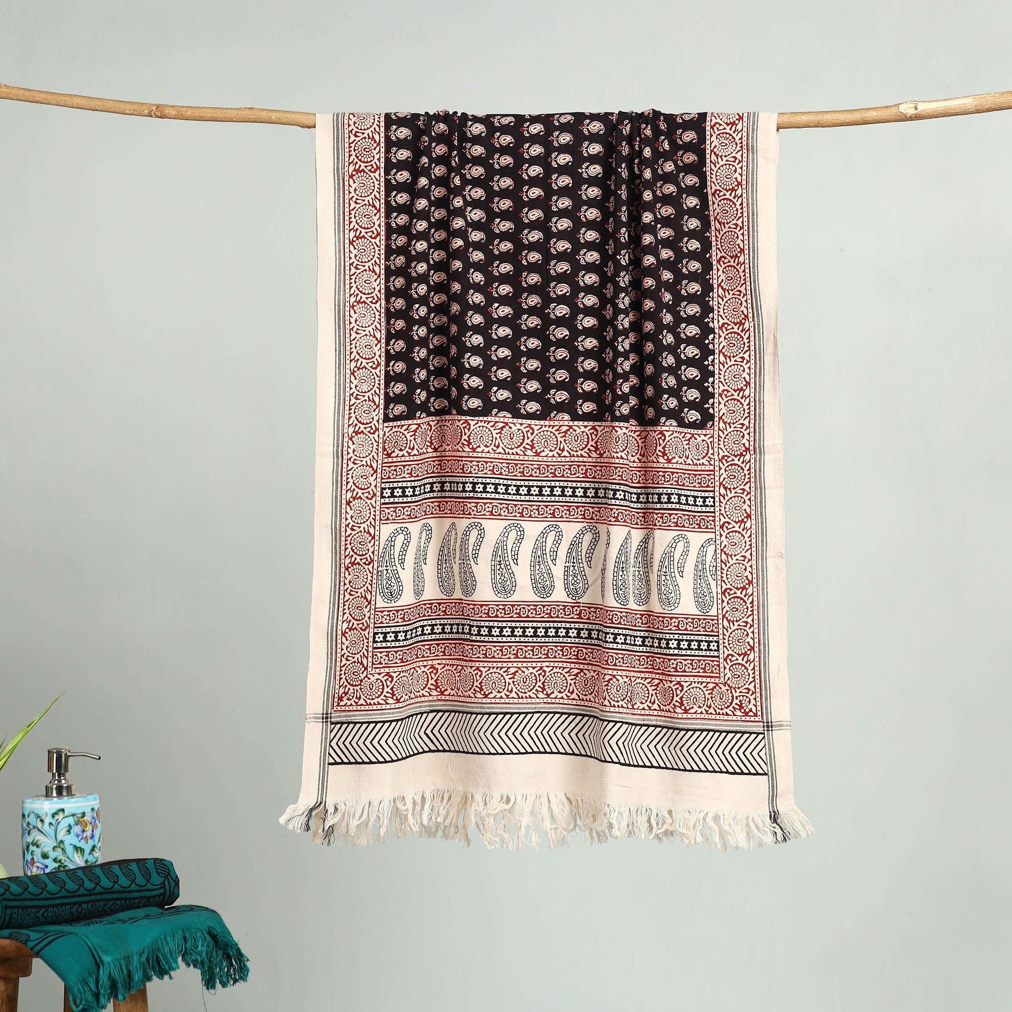 Indulge in the soft comfort and artistic beauty of the fine quality red bagh hand block printed pure handloom cotton towel. This exquisite towel is meticulously crafted using traditional techniques by master artisan Umar Faruk Khatri, who practices the art of bagh hand block printing in Bagh, the Dhar district of Madhya Pradesh.