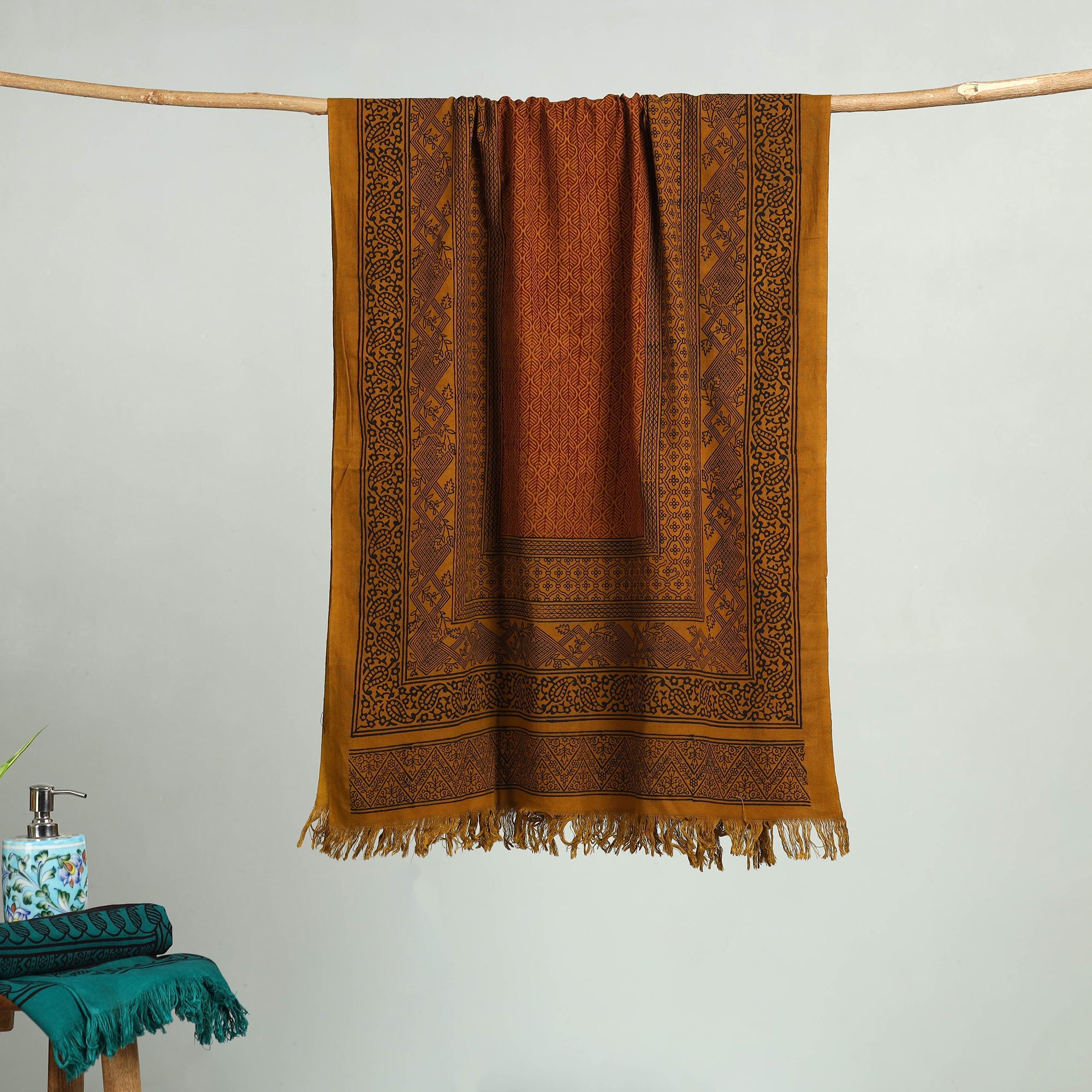 Indulge in the soft comfort and artistic beauty of the fine quality orange bagh hand block printed pure handloom cotton towel. This exquisite towel is meticulously crafted using traditional techniques by master artisan Umar Faruk Khatri, who practices the art of bagh hand block printing in Bagh, the Dhar district of Madhya Pradesh.