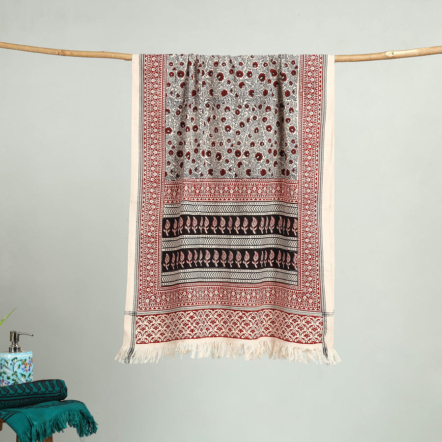 Indulge in the soft comfort and artistic beauty of the fine quality grey bagh hand block printed pure handloom cotton towel. This exquisite towel is meticulously crafted using traditional techniques by master artisan Umar Faruk Khatri, who practices the art of bagh hand block printing in Bagh, the Dhar district of Madhya Pradesh.